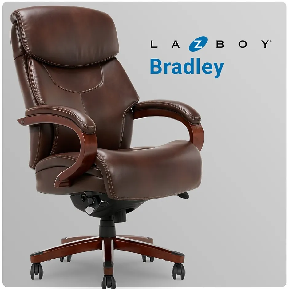 Give your workspace an air of sophistication with this La-Z-Boy Bradley executive chair. The soft bonded leather upholstery offers a rich, inviting texture, while the warm color scheme delivers classic style. The elevated headrest, built-in lumbar support and curved waterfall seat provide all-day comfort. This desk chair features simple controls, so you can adjust the seat height and tilt tension to meet your personal preferences. A sturdy five-star base and rolling casters make it easy to move this chair from your desk to a nearby filing cabinet, credenza or printer stand. Complete with rich wood-finish accents, this La-Z-Boy Bradley executive chair brings CEO-worthy good looks to your corner office.