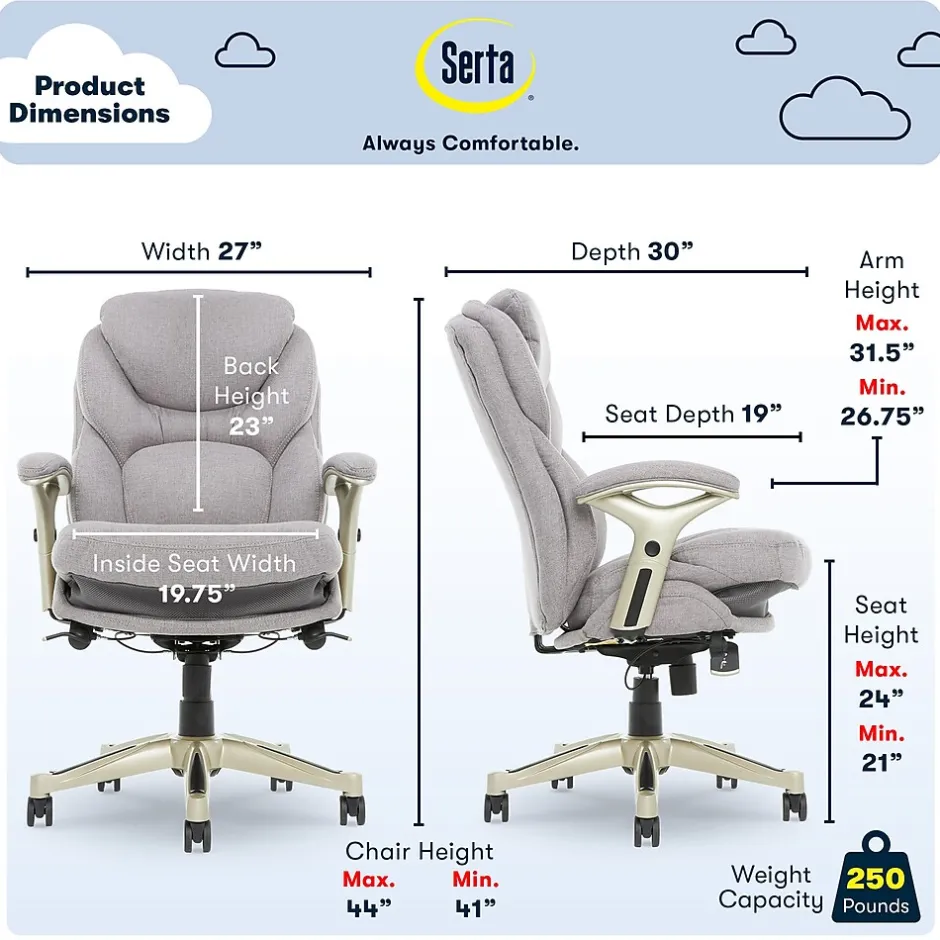 Imagine an office chair that helps promote strength and flexibility in your back. That’s the Serta Works ergonomic executive office chair with Back in Motion technology. This feature-rich, performance-focused chair helps its users become more productive and efficient by maximizing lower back support and comfort while seated. The Back in Motion active seat technology swivels the lumbar forward like the pelvis tilt exercise, promoting strength and flexibility in your core. The chair’s push-button adjustable armrests and pneumatic height adjustment can be customized to find the right fit for you. And the multi-layered cushions are comfortable yet supportive, so you’ll feel refreshed and rejuvenated, even after a long day.