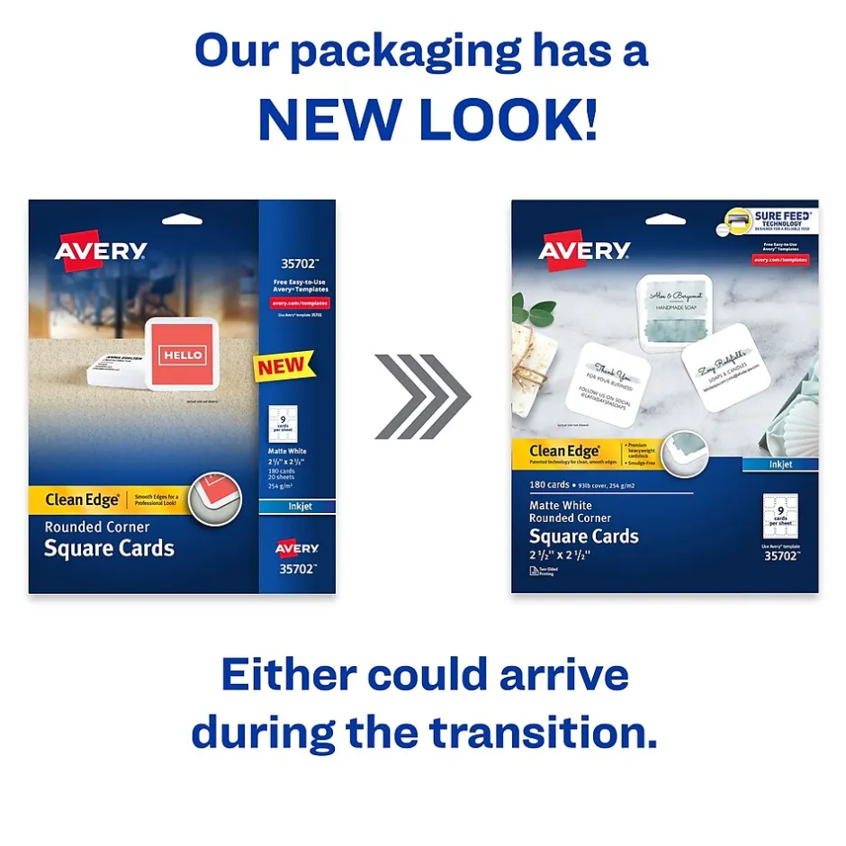 Make sure your cards stand out with Avery 35702 square cards with rounded corners. This pack of 180 first-rate customizable business cards is made from quality cardstock with a weight of 93lbs / 254gsm, and offers an impressively substantial look and feel, while the curved corners help avoid snagging and creasing. If you need professional quality business cards, customer loyalty cards, appointment reminder cards or more, these 2.5″ x 2.5″ cards are an exceptional way to stand out from the crowd. These white business cards have innovative Clean Edge technology for quick and easy separation, giving you the cleanest, smoothest edges of any business card on the market. Also, proprietary Avery Sure Feed technology helps reduce misalignments, minimize paper jams, and avoid wasted projects when printing on your inkjet printer.Whether you have your own design or you’re creating one from scratch, take your brand or business to the next level with Avery Design & Print Online, which makes it easy to create and print double-sided customizable cards from your own home or business. The free browser-based software has everything you need to design business thank you cards, appointment cards, reward cards, mini RSVP cards, cute business cards and more. Try it out today on the Avery website and print at home or in the office on your inkjet printer.