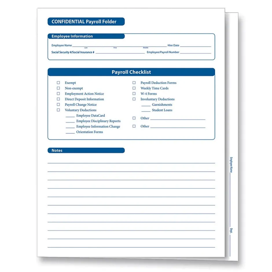 The ComplyRight Confidential Employee Payroll Records Folder keeps all your employee payroll records stored in one secure and convenient place. This folders holds all payroll documents, including wage and salary history, federal awithholding, payroll change notices, direct deposit information and payroll deductions.