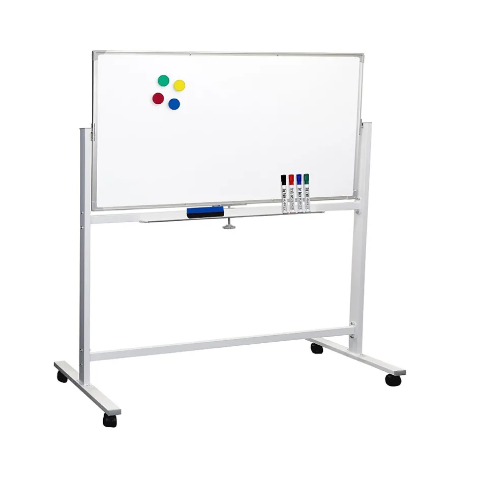 This dual-sided 32″ x 48″ whiteboard features easy 360-degree rotation and locks into position with a bottom lock clip. Perfect setup for classrooms, offices, conference rooms, and home use. Comes with a silver-tone finish aluminum frame that is both lightweight for easy mobility and durable. Four lockable casters are included to keep your whiteboard in place. Reversible whiteboard on wheels includes four dry-erase markers, an eraser, four magnets, and a marker tray.