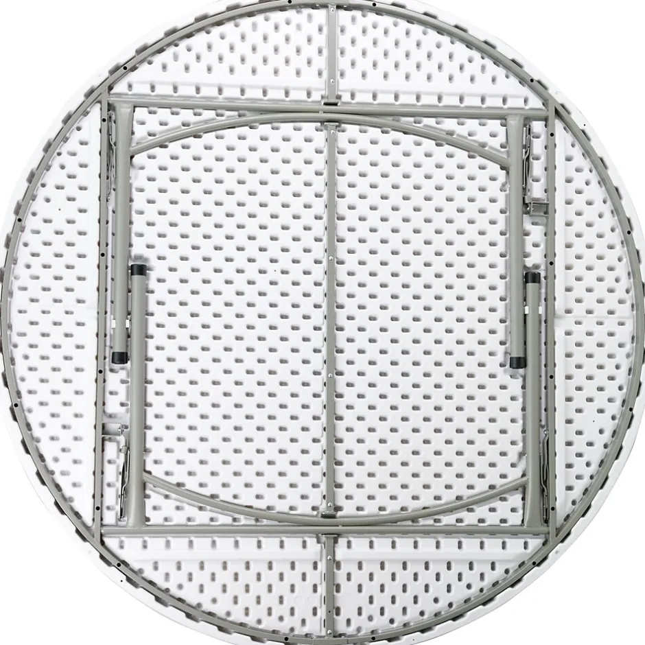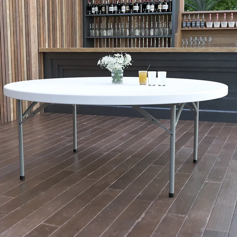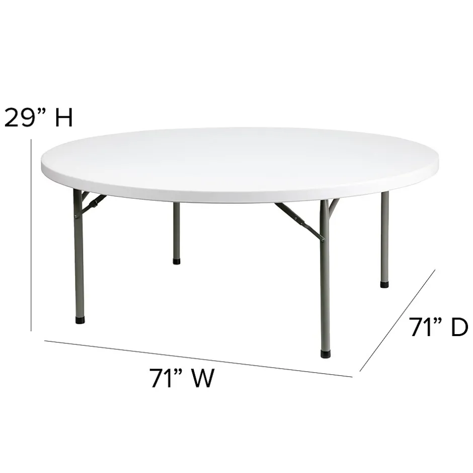 Ensure you have enough surface space for any function and take the stress out of hosting your next gathering. The round dining folding table is a great option for special event planners, catering companies and banquet facilities. This durable, easy to clean table is commercial rated for use in banquet halls, convention centers and at trade shows. Use during game night, dress it up for holiday parties, and coordinate crafts night. The thick, granite white tabletop is 72″ in diameter, 2.125″ thick, and will comfortably seat up to 10 adults. Its waterproof, impact and stain resistant top have a 1100 pound static load capacity. Attractive gray powder coated legs lock securely in place while in use and non-marring floor caps protect your floor by sliding smoothly when you need to move the table. Designed for both indoor and outdoor use, store table indoors and protect the frame from extreme moisture. The 60″ Round Granite White Plastic Folding Table is a convenient option for your next home, school or business event.