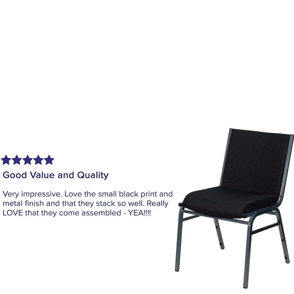 When you need comfortable seating, these padded stack chairs offer versatility to be used in a myriad of environments. Utilize this multipurpose side chair in the church, office, classroom, training room or in the home. This stacking side chair can create uniform, row seating with the included ganging bracket. Add flexible reception chairs in your lobby to keep guests comfortable as they await to be seen or use as a side office chair for meetings. Built for durability, the heavy duty frame with bumper guards prevent the finish on the frame from being scratched when stacked. To make transporting even easier, equip yourself with the appropriate sized stack chair dolly. So when in need of temporary or permanent seating this multi-purpose stack chair is sure to meet the needs for any venue.