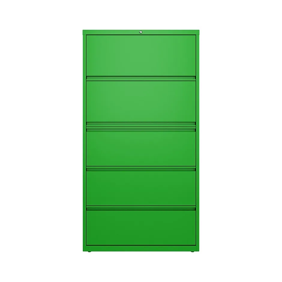 - Five-drawer lateral file cabinet holds letter-, legal-, or A4-size documents