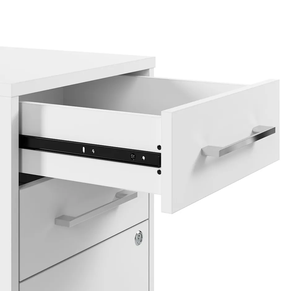 The Bush Business Furniture Hustle 3 Drawer Mobile File Cabinet provides the form and function needed to support your entrepreneurial spirit without breaking the bank. An ideal choice for small to medium-size businesses and home offices alike, the small filing cabinet rolls effortlessly throughout your workspace to provide storage where it’s needed most. The bottom drawer opens on smooth full-extension ball bearing slides for easy access to letter, legal, and A4-size paperwork while two box drawers organize writing utensils and other small office supplies. Drawers can be locked to safeguard sensitive documents as well as valuable items. This 3 drawer file cabinet with wheels has been meticulously designed and tested to meet or exceed ANSI/BIFMA standards for safety, durability, and performance and is backed by a 10 Year Manufacturer’s Warranty. American made with U.S. and imported parts.