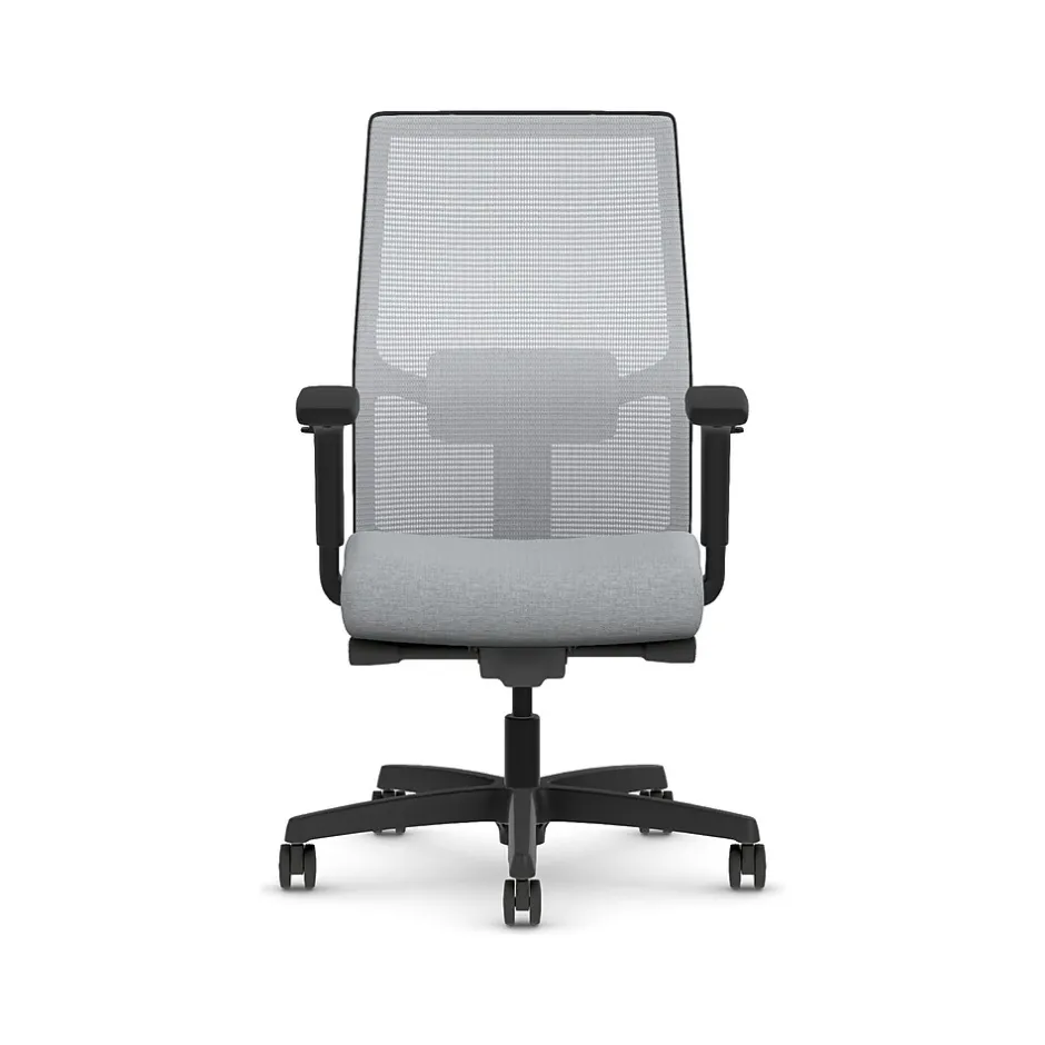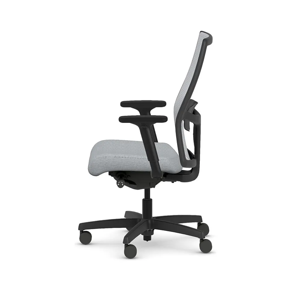 - Four-way stretch mesh back in fog gray, Hamilton cloud gray fabric seat, and black frame