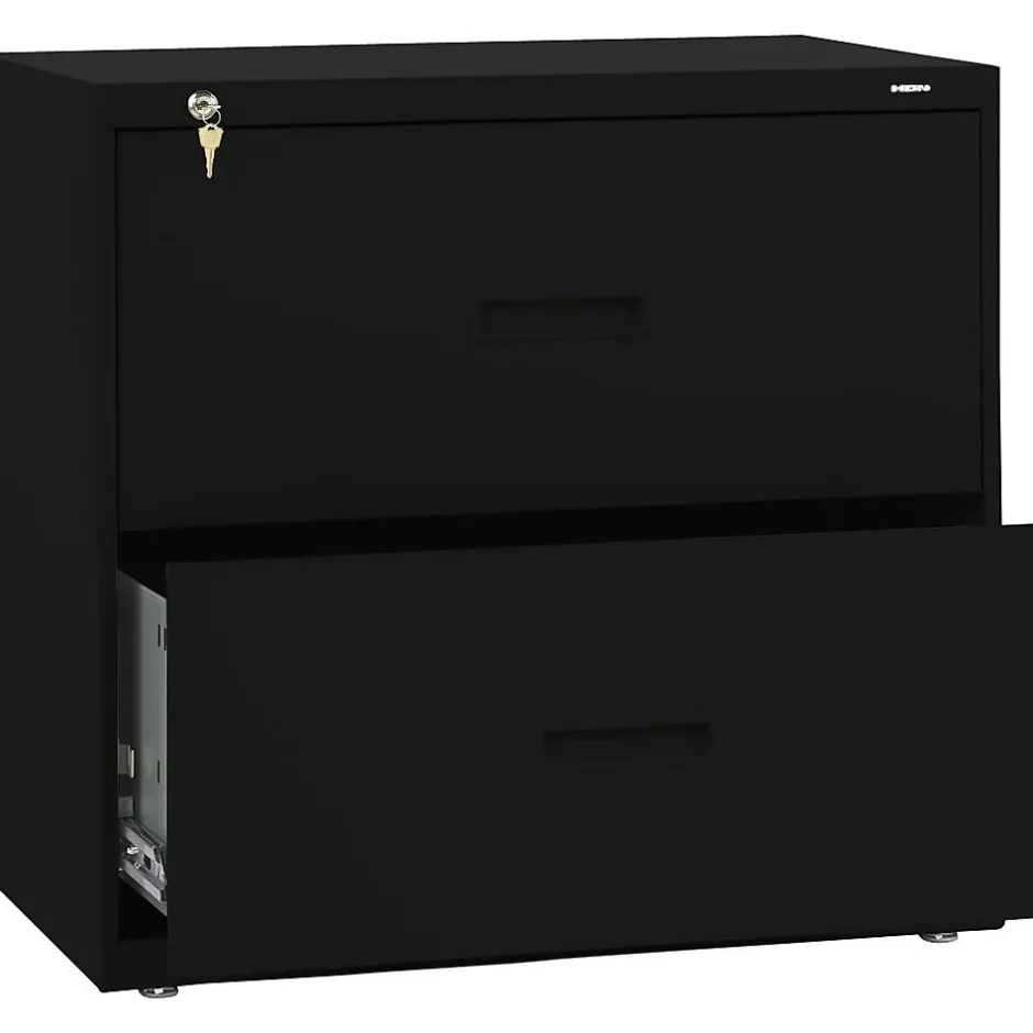This two-drawer, 30″W model has a tamper-resistant enclosed base. Cabinet accepts letter or legal hanging file folders. Molded polymer handle is standard. Finish color is Black.