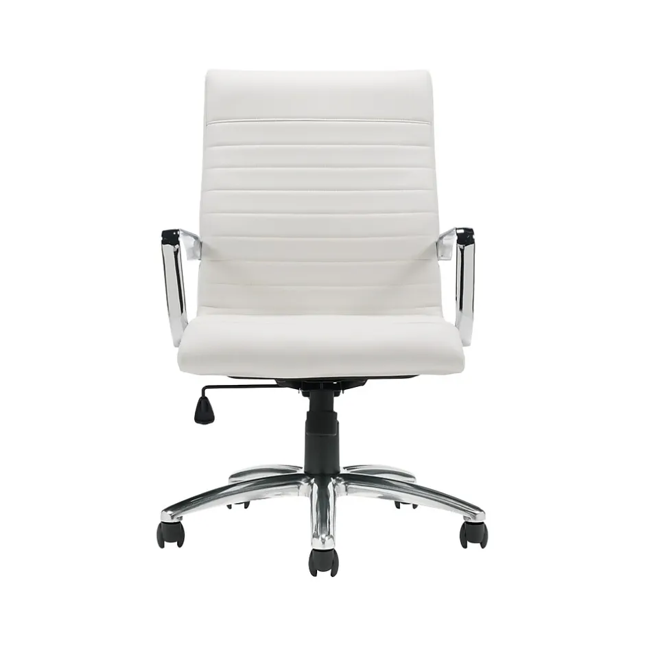 This Offices to go executive chair features Luxhide upholstery with mock leather trim. Pneumatic seat provides height adjustment. Single-position tilt lock with swivel tilt mechanism and tilt tension adjustment. Also featuring concealed frame with polished aluminum base and twin-wheel carpet casters.