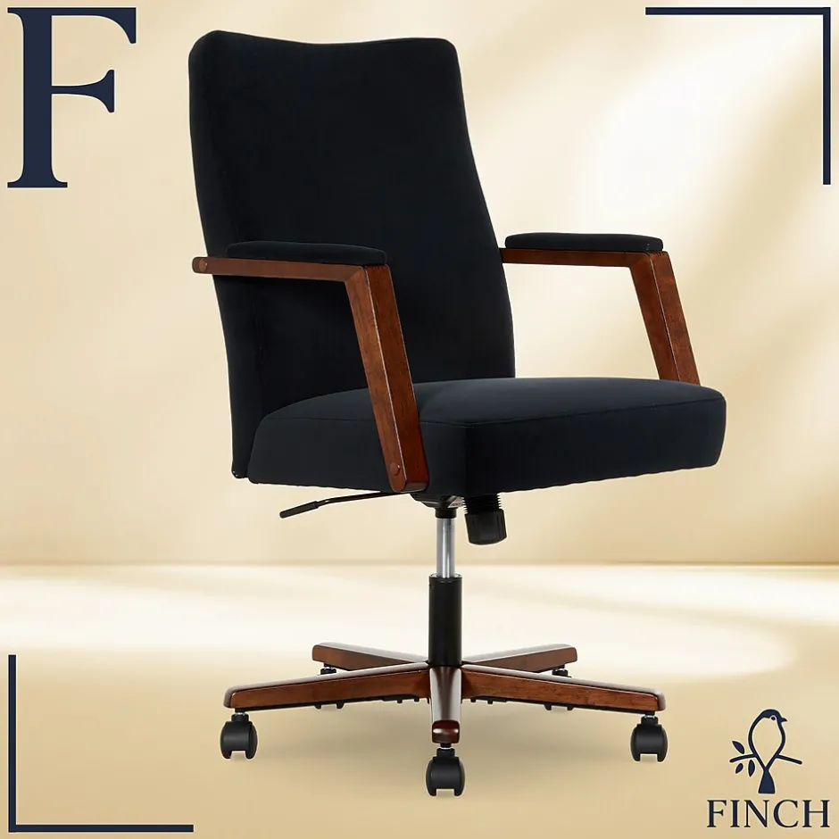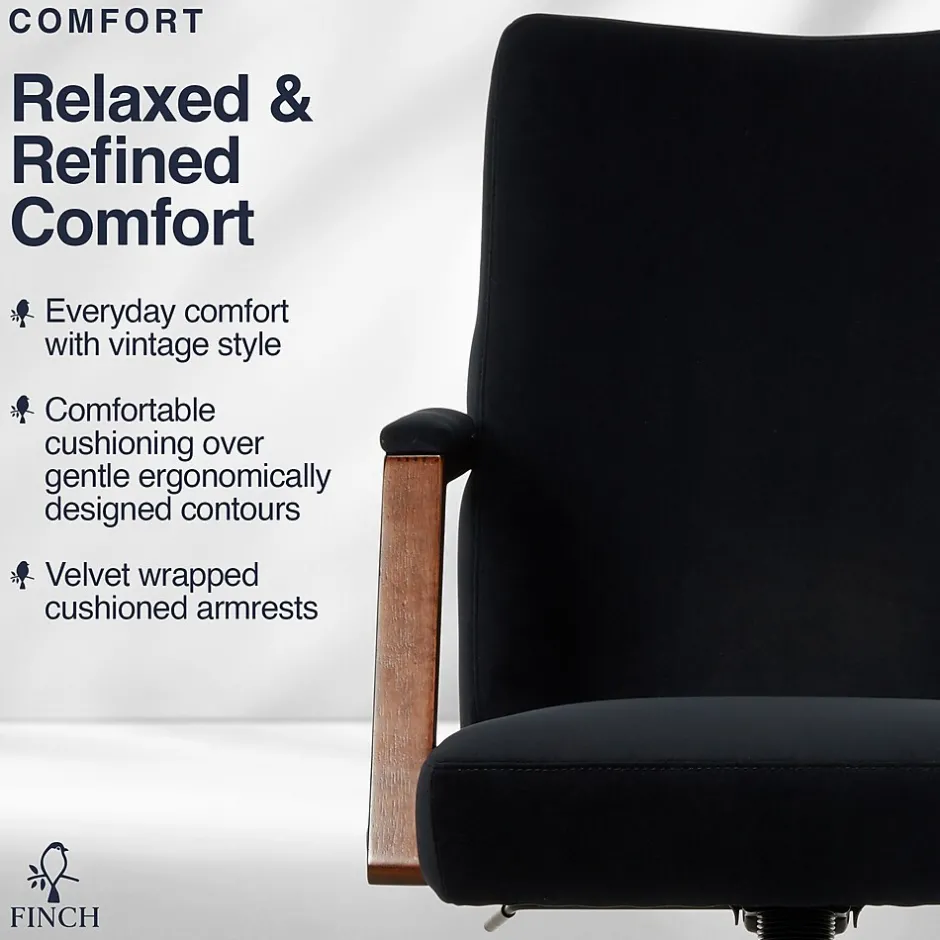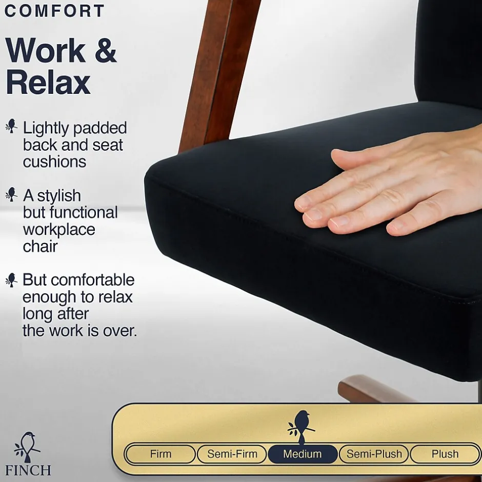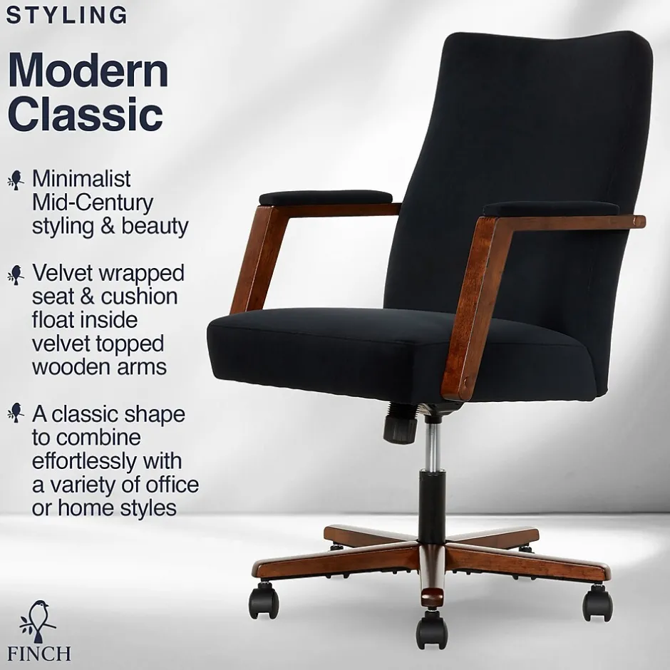 Thank you for considering a Finch branded product. Finch branded products blend styles and materials and deliver practicality. Our products try to be unique, stylish, authentic, and always affordable. Distinguished by a classic shape with crisp and clean lines, the Neo One by Finch is a mid-back office chair with a vintage aesthetic that’s inspired by iconic mid-century modern designs. Beyond its captivating style, the Neo One features a gently contoured backrest, geometrically padded arms, and a cushioned seat – all lightly padded for medium comfort with enough support for good posture. Upholstered in a soft and cozy velvet fabric, 3 colors in Black, Cream, or Gray provide a luxurious contrast against the stunning graining detail of the wooden armrests and base, adding a touch of elegance to your workspace. The 360° swivel metal base on double-wheel casters glides smoothly across carpets or rugs, and can handle up to 275 lbs. An easy-to-reach side lever adjusts the seat height so you can find your ideal position and match your work setting. With a minimal and timeless silhouette, the Finch Neo One brings a sophisticated look to your office environment with functional support whether you have a dedicated home office or a stylish corner carved out of your living room.