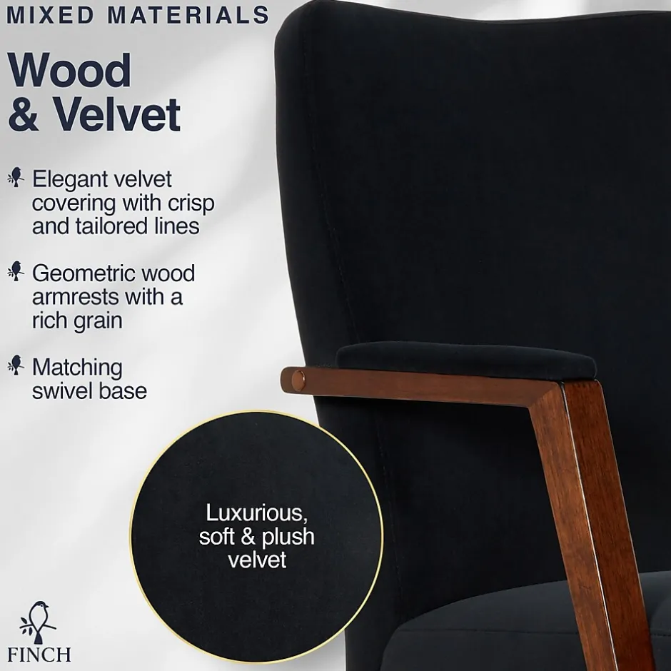 - VELVET & WOOD: The soft and luxurious velvet fabric contrasts the wooden armrests and matching base with a rich wood grain finish to accentuate any decor. Available in 3 color options: Black, Cream, or Gray.