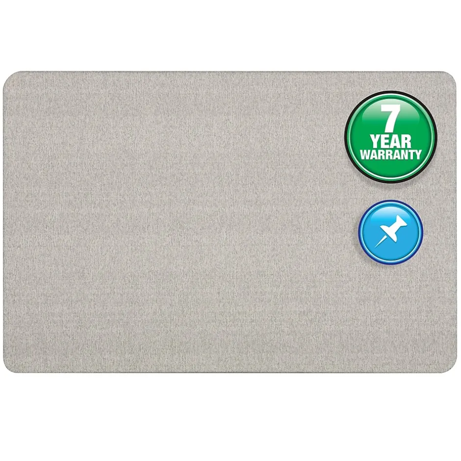 Pin documents up and out of the way with this Quartet Oval Office 3′ x 4′ fabric bulletin board. This bulletin board features a light gray fabric surface backed by high-density fiberboard and a frameless design that provides more usable space. The backing is water-resistant and firmly holds pins in place. This 3′ x 4′ board comes with mounting hardware and offers vertical or horizontal configuration.