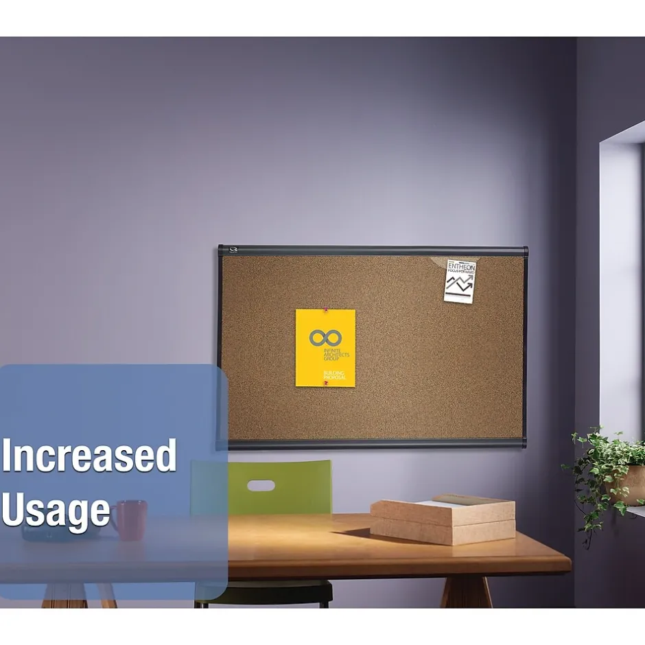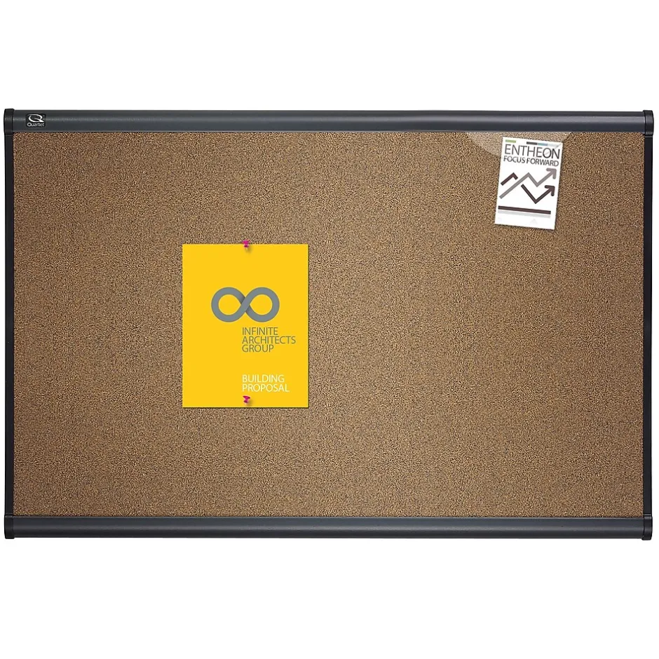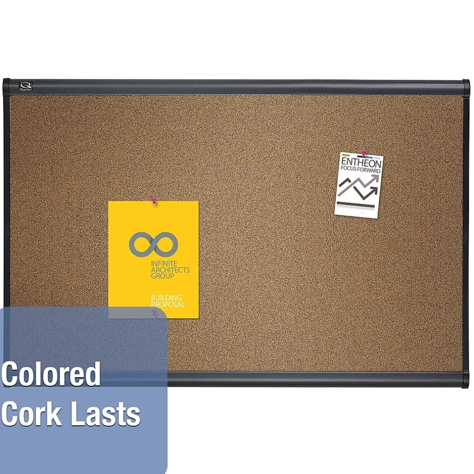 Get more out of empty wall space with a versatile display thanks to this 4′ x 6′ Quartet Prestige bulletin board. This board features a graphite-finish aluminum frame and a self-healing colored-cork surface backed by high-density fiberboard that firmly holds your items with pins. This board comes with the Easy Mount hanging system for quick set up and Quick Clips for when you need to secure material without damage.