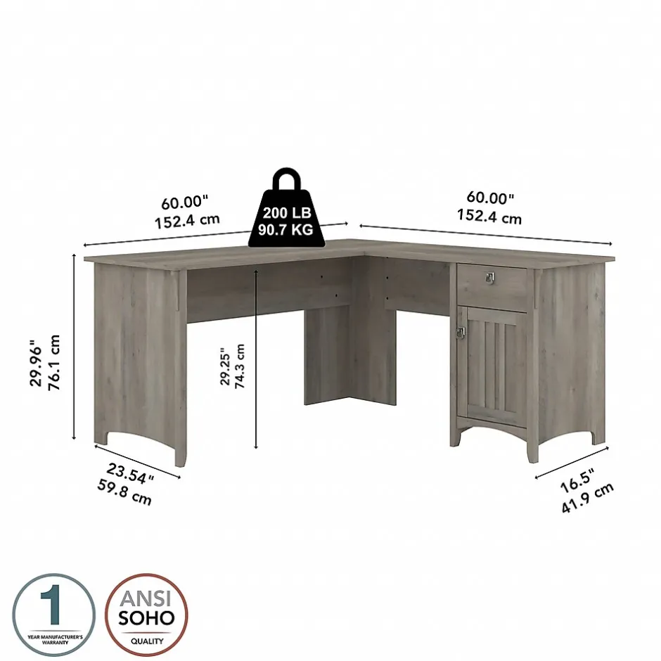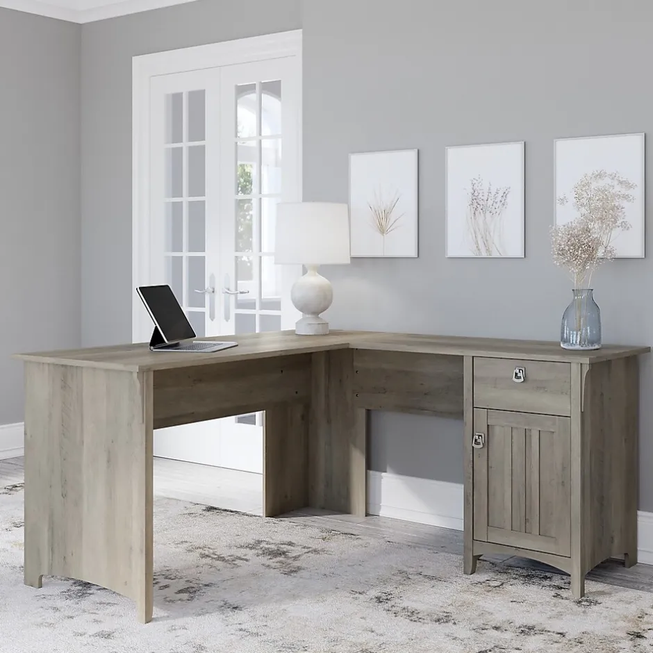 Make your home office space comfortable, functional, and beautiful with the Bush Furniture Salinas L-shaped computer desk with storage. Attractive wood details, vertical accents, curved base rails, and tapered legs inspired by Mission styling create a casual look fit for any cottage, family home, or apartment. You’ll love all the room you have to multitask on the L-shaped desk designed to save space in your home with a variety of placement options, including in the corner. The desktop supports up to 200 lbs., so you can get to work with all your materials close by. Store writing utensils and small office supplies in the convenient box drawer and keep larger items in a vertical storage cabinet that features an adjustable shelf. This corner desk with storage is tested to meet ANSI/SOHO quality standards for safety and performance and is backed by the Bush Furniture 1-year manufacturer limited warranty.