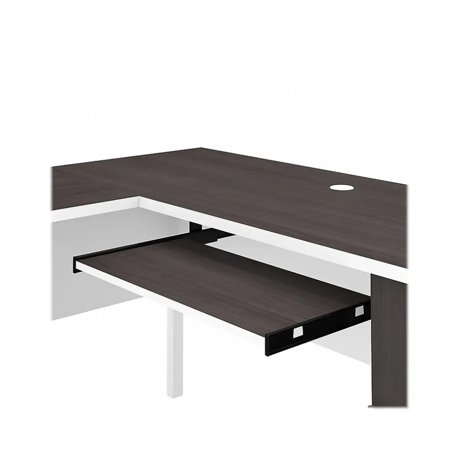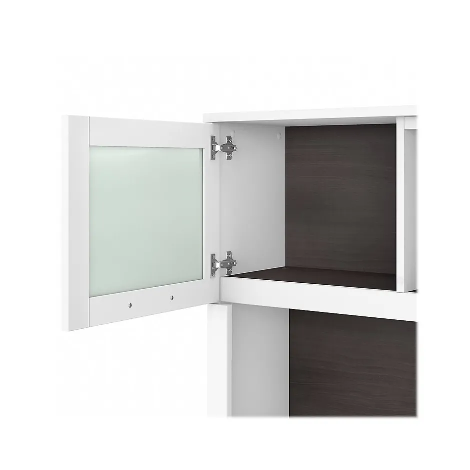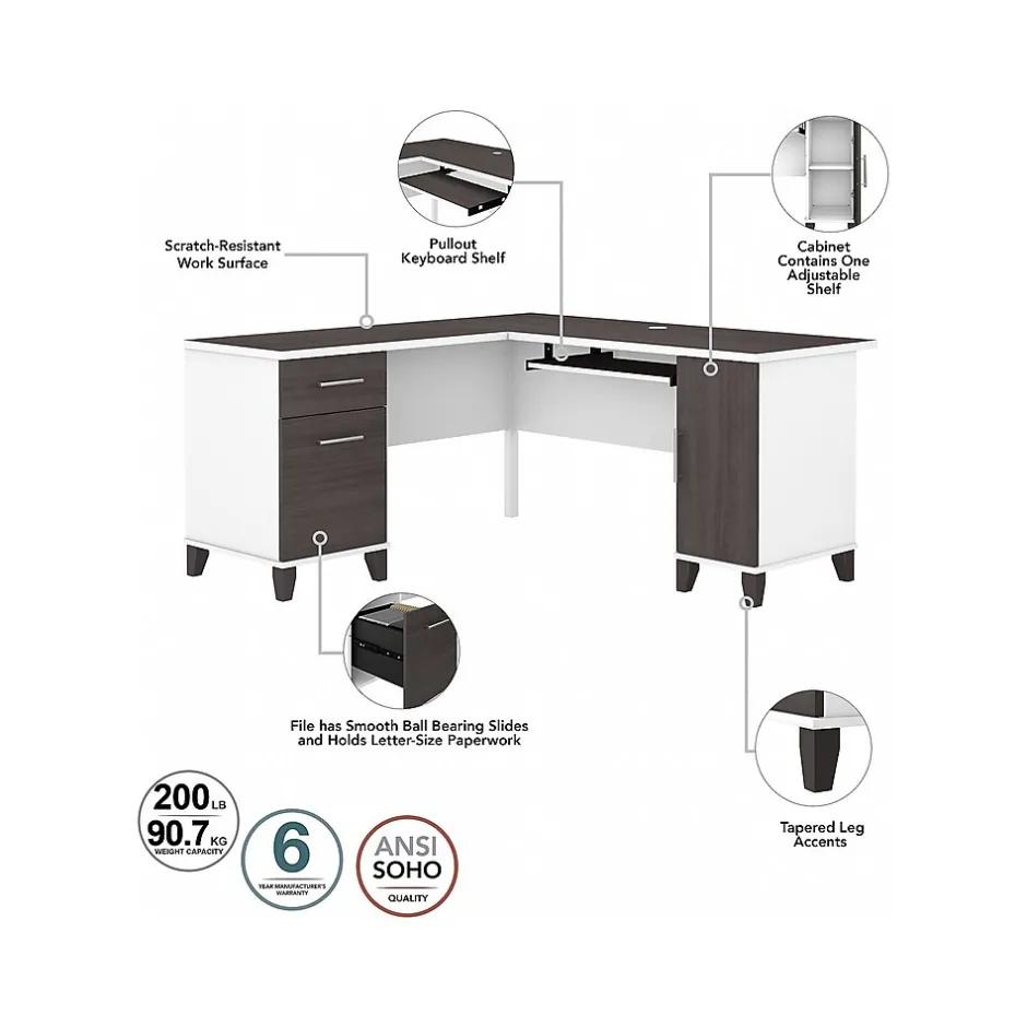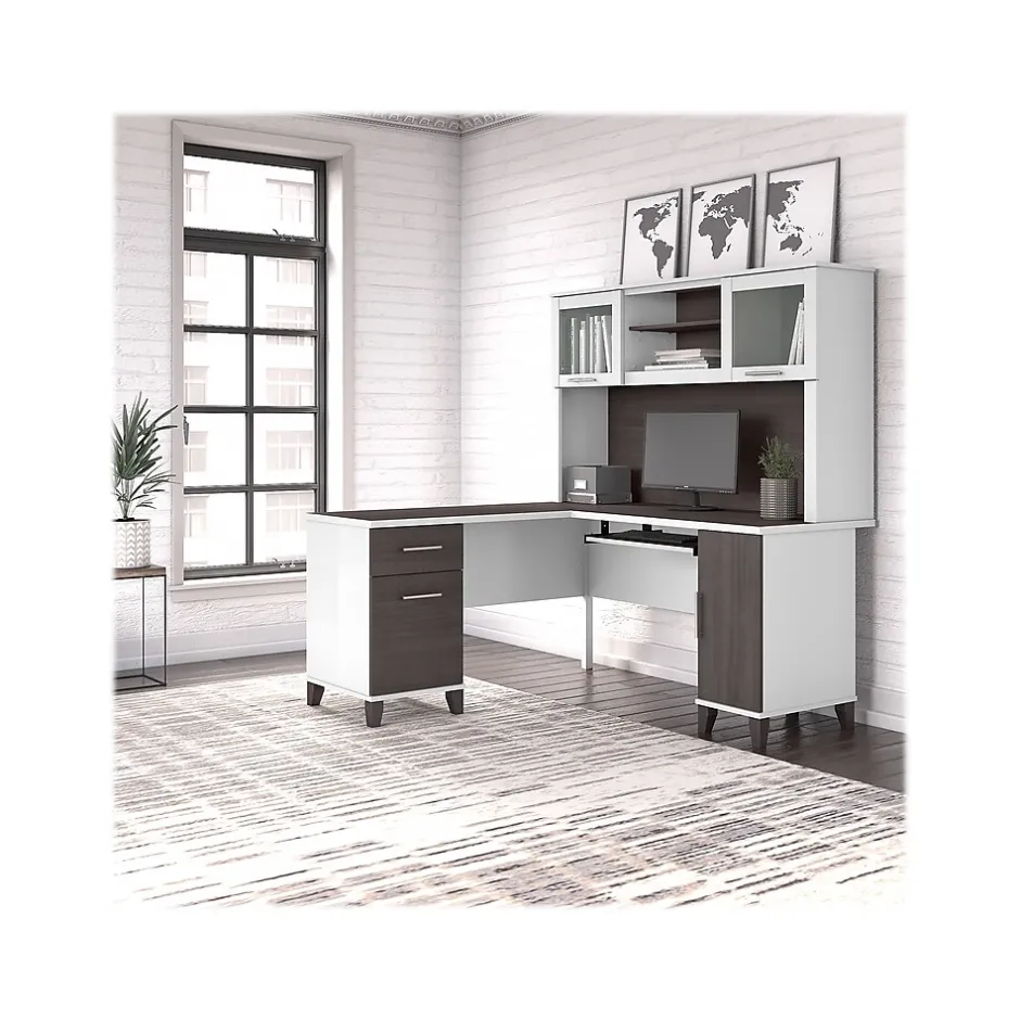Maximize the potential of your home office with the Bush Furniture Somerset 60″W L-shaped desk with hutch. Create your remote work headquarters with space for a computer, phone, printer, and more. A convenient pullout shelf provides a perfect place to keep a keyboard or laptop, while a storage cabinet and box drawer offer plenty of space for supplies. A file drawer with ball bearing slides allows for easy access to letter-size documents. A wire management slot helps keep cords and cables in order. The hutch features open compartment for books or decorations, an adjustable shelf to hold work in progress, and two frosted glass doors that provide concealed storage. This home office furniture set is tested to meet ANSI/SOHO standards for safety and performance and is backed by the Bush Furniture 6-year manufacturer warranty. American-made with US and imported parts.