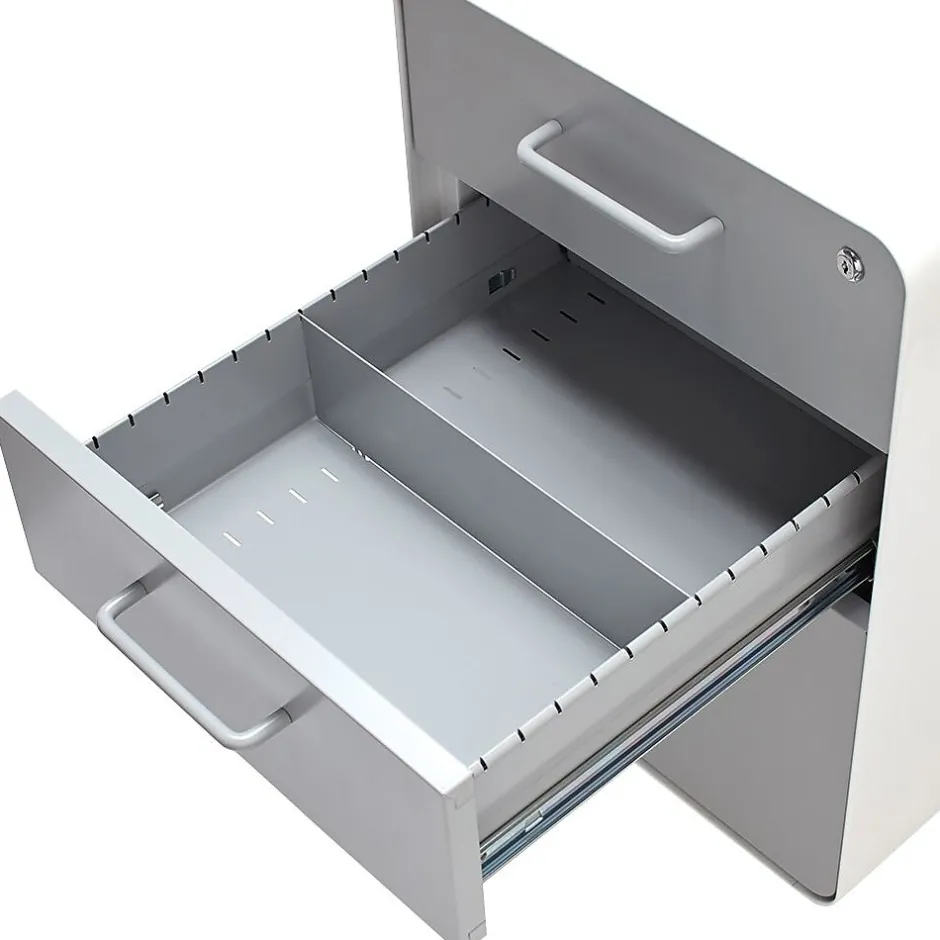 The White & Light Gray Stow 3-Drawer File Cabinet with Casters features Light Gray powder-coated steel construction with peek-a-boo matching Light Gray steel interior. Letter/legal size cabinet includes 2 utility drawers with adjustable drawer-dividers an d 1 hanging-file drawer.