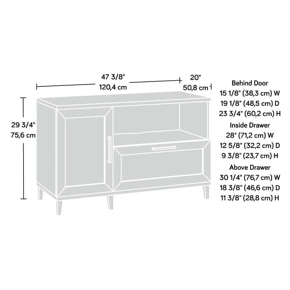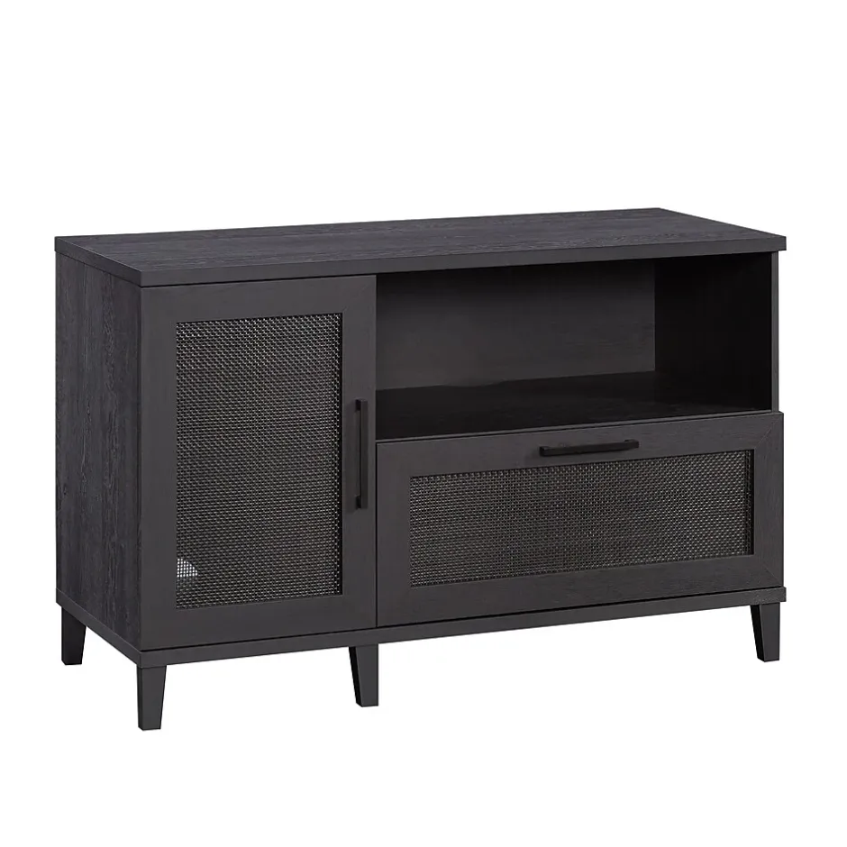 Add much needed storage space in your home office without feeling cramped with this handy and functional file credenza from the Tiffin Line collection. The spacious top surface of this office storage cabinet provides convenient storage for a printer or other equipment. This home office credenza features an adjustable shelf behind the door, allowing you to customize storage to your specific needs. Its versatile, sleek and adjusts to your needs, so what more could you ask for? Well, a file drawer would be helpful. This credenza with open shelf includes a file drawer with full extension slides that holds letter or legal-size hanging files. This keeps your documents organized, out of sight, and easy to locate. Finished in a dark Raven Oak and detailed with rattan insert door and drawer fronts, this office storage credenza is an attractive and highly practical addition to your home or office.