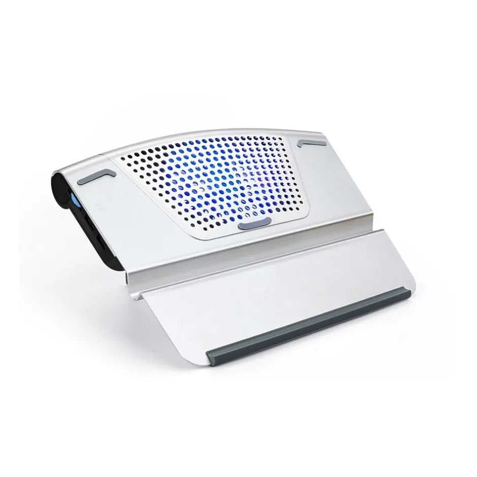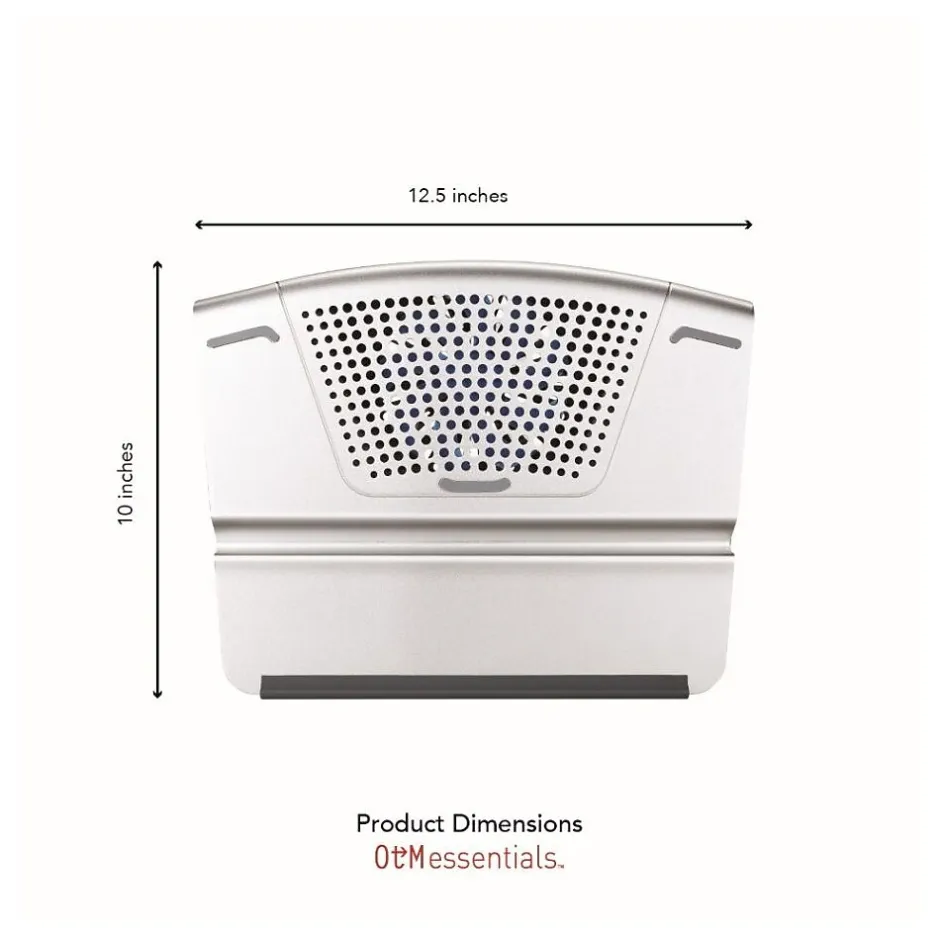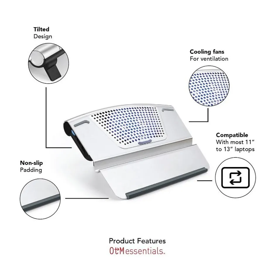 The OTM Essentials aluminum laptop riser stand features nonslip padding to hold the laptop securely in place and cooling fans to help keep the laptop ventilated. Tilted design allows for maximum comfort.
