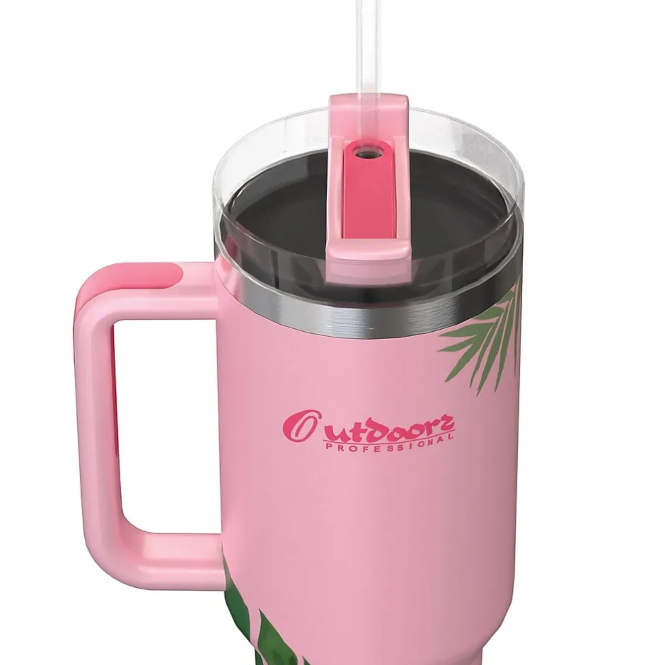 The Outdoors Professional 40-Oz. Tropical Pink Tumbler’s double-walled, vacuum-insulated technology will keep iced drinks cold for up to 48 hours, no-ice drinks chilled up to 11 hours, and hot drinks hot for up to 7 hours! No more settling for lukewarm sips or diluted flavors! If you’re on the go, this tumbler is built to fit any standard cup-holder. These tumblers are lightweight and durable. Crafted with stainless steel that is 100% BPA-free and nontoxic, this tumbler is built to withstand the rigors of everyday use, ensuring its durability for years to come. This tumbler features a screw-on splashproof straw lid to avoid spills and leaks. It’s not only lightweight and easy to carry but super easy to clean. Hand-washing is a breeze as the wide mouth allows for effortless access to every nook and cranny. It’s also dishwasher-friendly: simply toss it in, let the dishwasher work its magic, and have a sparkling clean tumbler!