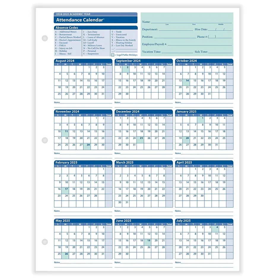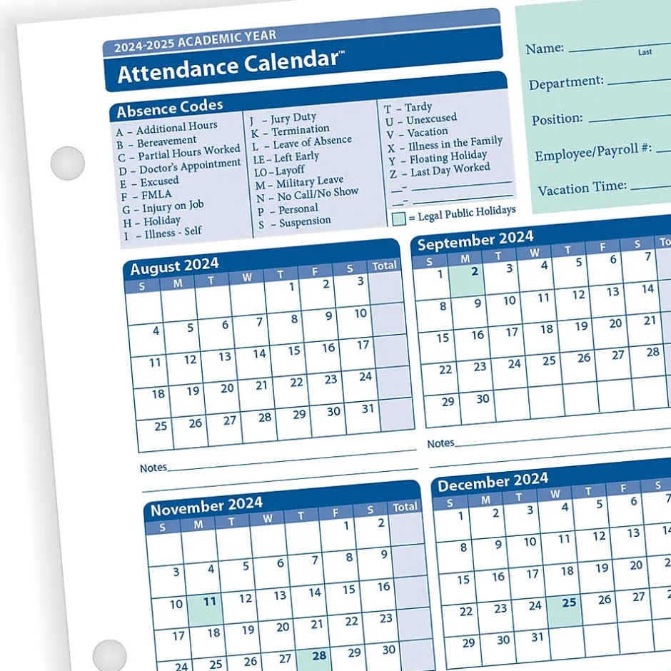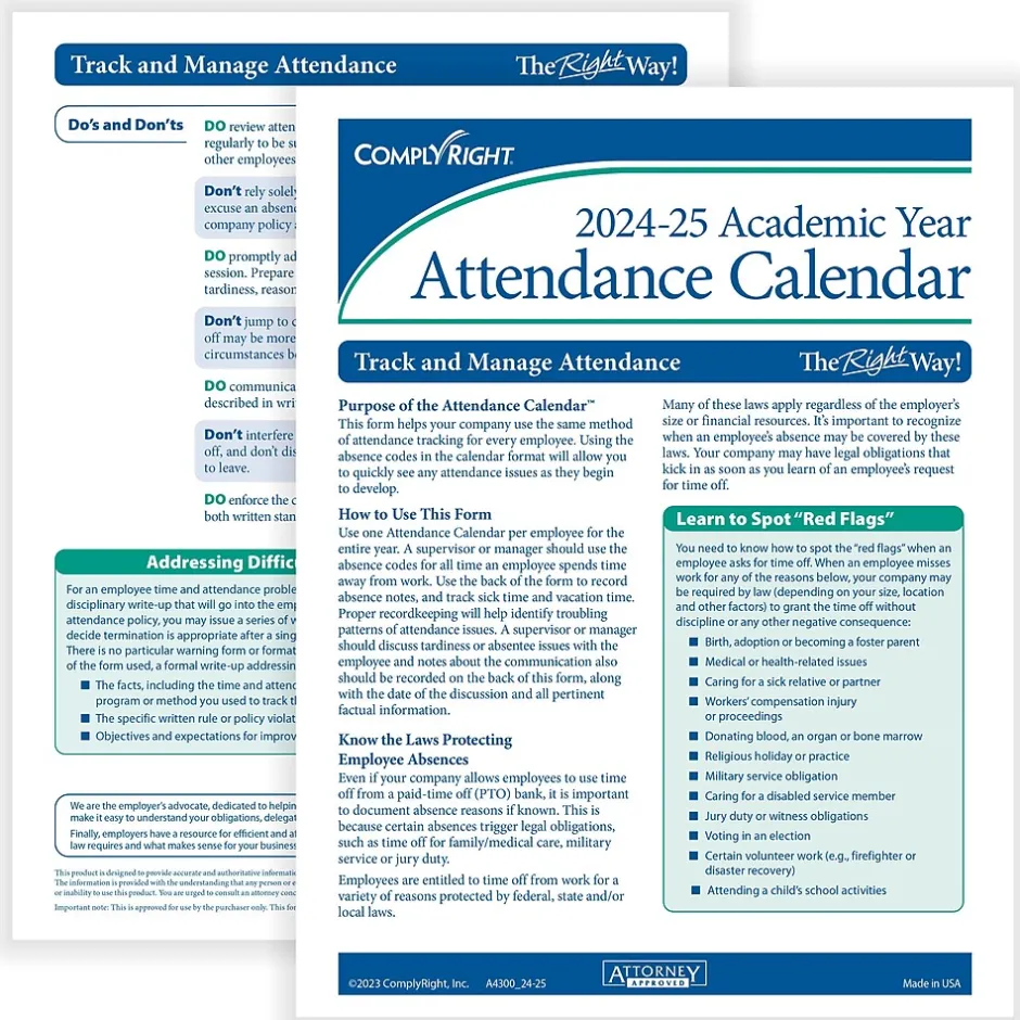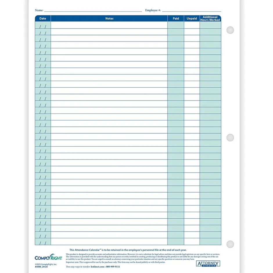 The efficient calendar format of the ComplyRight Academic Year Attendance Calendarâ„¢ (August 1 – July 31) and easy coding system make tracking absences quick and convenient. The reverse side of the cards includes plenty of space to record notes and warnings. This pack of 50 includes ComplyRight tips for optimal use.