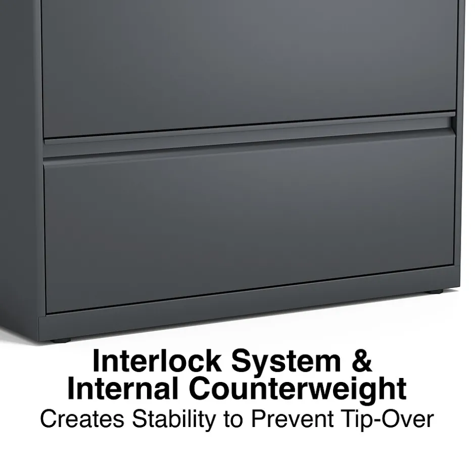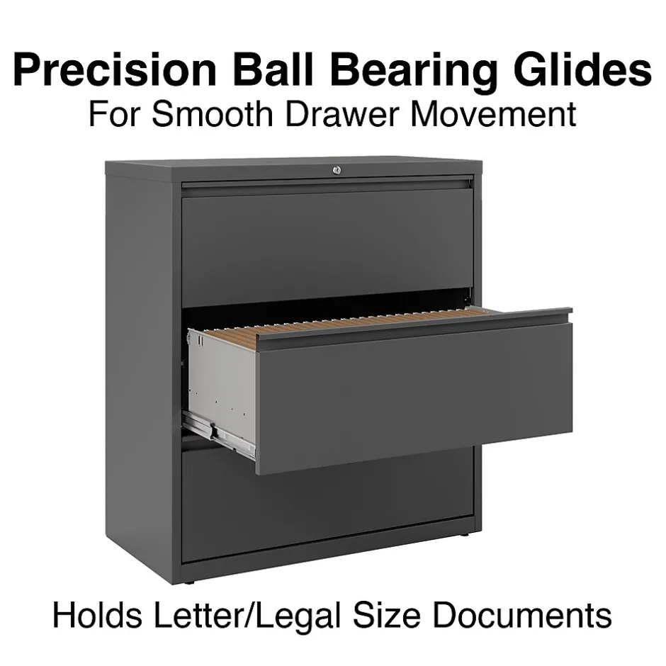 Get a durable, space-efficient solution to record storage with this three-drawer lateral file cabinet. Featuring a compact design, this cabinet fits easily in workplaces of all sizes and has a fine black finish and a sleek appearance that blends well with existing decor. The three 36-inch-wide drawers offer ample space for letter and legal-size hanging folders, ideal for document storage and recordkeeping. This lateral file cabinet lets you manage access to stored materials with a built-in lock.