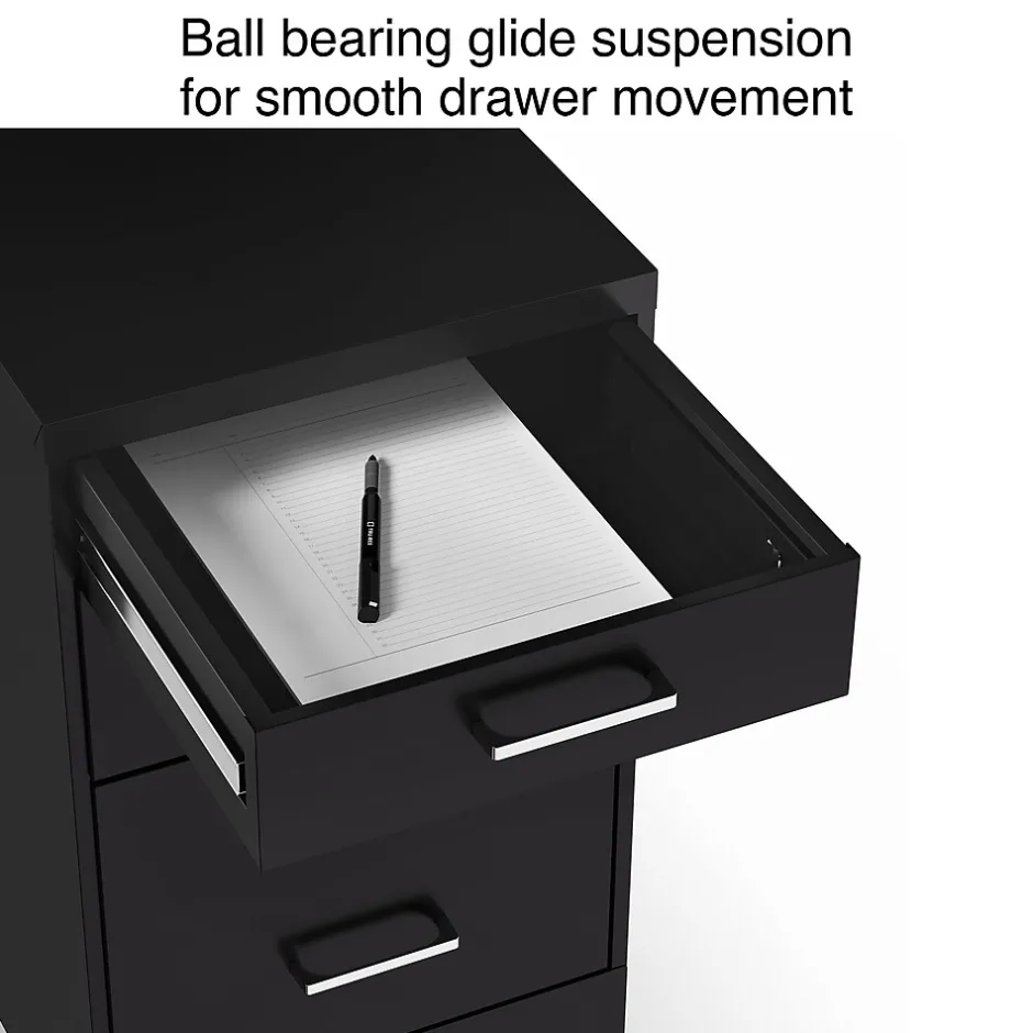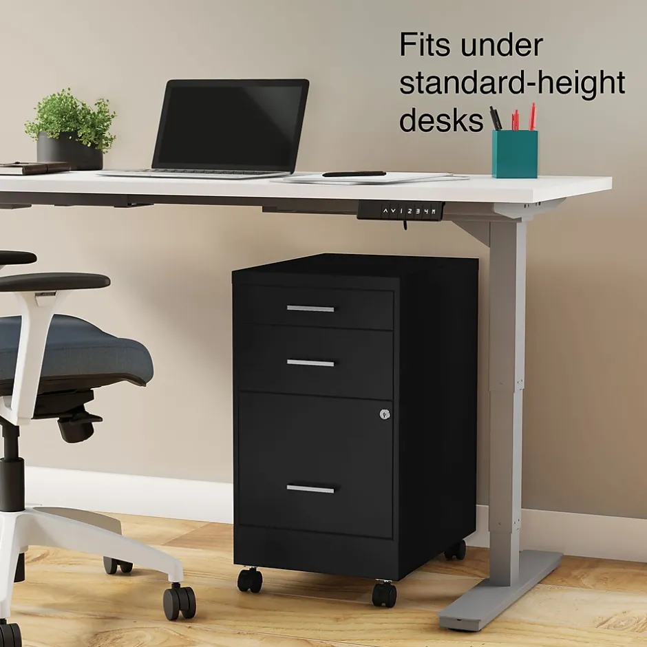 Expand your available storage options with this mobile file cabinet. Two box drawers offer space for office supplies, personal belongings and other small items, while the letter-size file drawer keeps paperwork close at hand. A keyed lock system prevents unauthorized access, keeping contents stored securely inside. This cabinet features rolling casters, so you can move your documents virtually anywhere in your workspace. With its compact size, this three-drawer vertical file cabinet fits neatly under a desk or in smaller spaces.