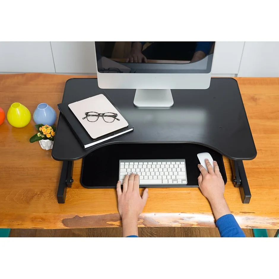 The R ADRB standing desk converter now optimizes your ergonomic work position with Enhanced Vertical Range, which seamlessly raises your tabletop up to 16.7″ and lowers it down to 4.75″. The large 32″ x 20.5″ desktop can hold up to 2 monitors along with other small accessories. Its full size 24″ x 11.5″ retractable keyboard tray holds a laptop or keyboard as well as a mouse. This sturdy adjustable workstation arrives fully assembled with nonskid pads to protect your desk from scratches. The black laminated finish will complement any color scheme.