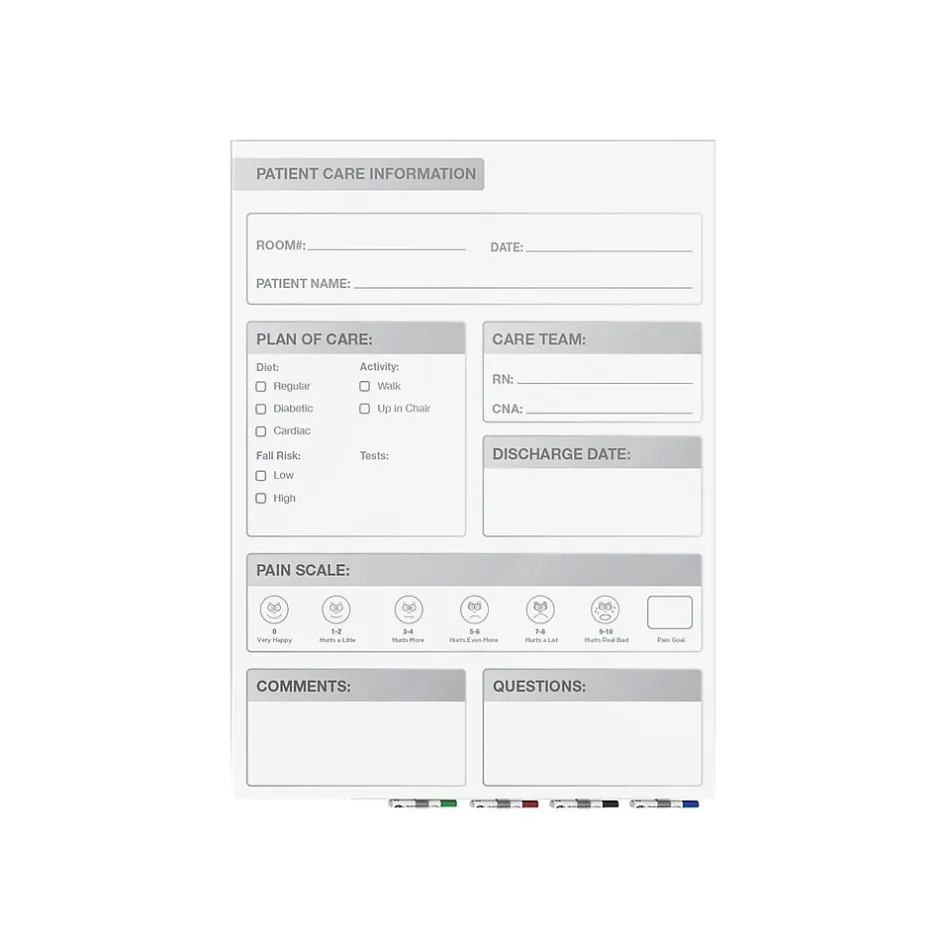 Ghent’s graphic glassboards are visually enhanced to encourage communication and collaboration. Ghent’s Patient Room dry erase glassboards improve communication and reduce anxiety for patients and employees. Patient room boards have been proven to increase HCAHPS scores by up to 6 points. The entire surface easily wipes off with a soft cloth, disinfectant wipe, alcohol or water. Ghent’s glassboards are resistant to bacteria and germs, which helps with infection prevention. Our Glassboard with Stand-Offs feature a hideaway marker storage to keep the board clutter-free. Graphics are produced in gray to seamlessly match any interior and will never stain, ghost or fade.