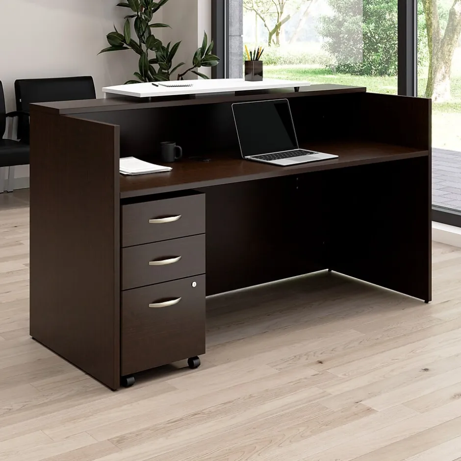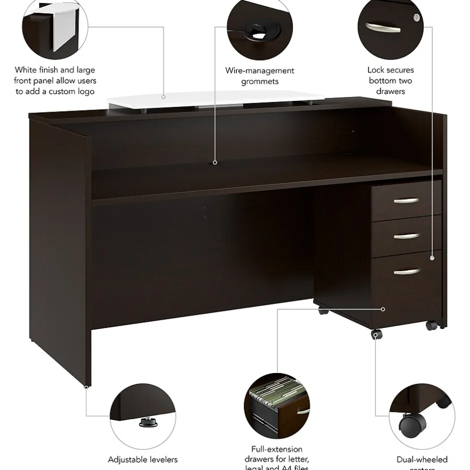 The Bush Business Furniture Arrive 72W x 30D Reception Desk with Counter and Mobile File Cabinet provides a stylish and practical solution for welcoming guests to your office’s waiting room. Greet visitors at a front desk that includes a raised shelf and counter that offer space to represent your business with a custom logo. The durable thermally fused laminate surface protects against scratches and stains while a 200-pound weight capacity and built-in wire management grommets accommodate multiple monitors and other equipment. The rolling file cabinet features one drawer for letter, legal, and A4-size paperwork as well as two drawers for supplies. This commercial-grade receptionist desk with drawers has been meticulously tested to meet or exceed ANSI/BIFMA standards for safety, durability, and performance and is backed by a 10 Year Warranty. American made with U.S. and imported parts.