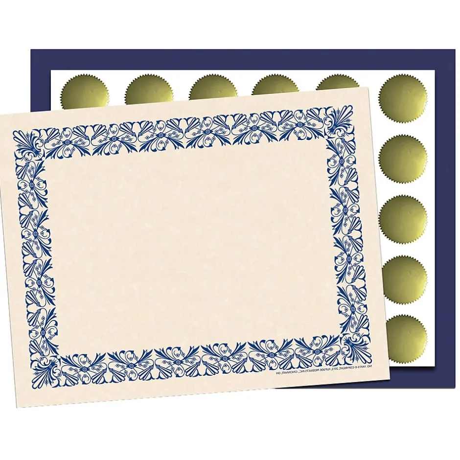 - Includes border paper, matching certificate folder, and gold foil seals.