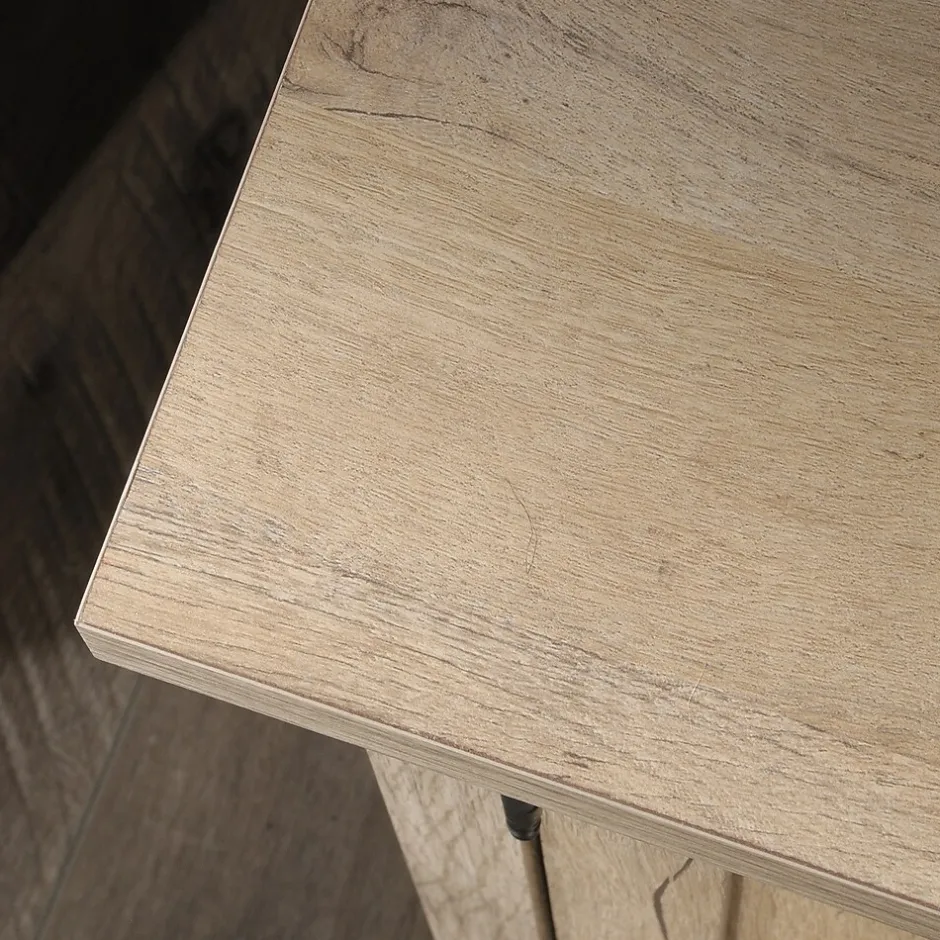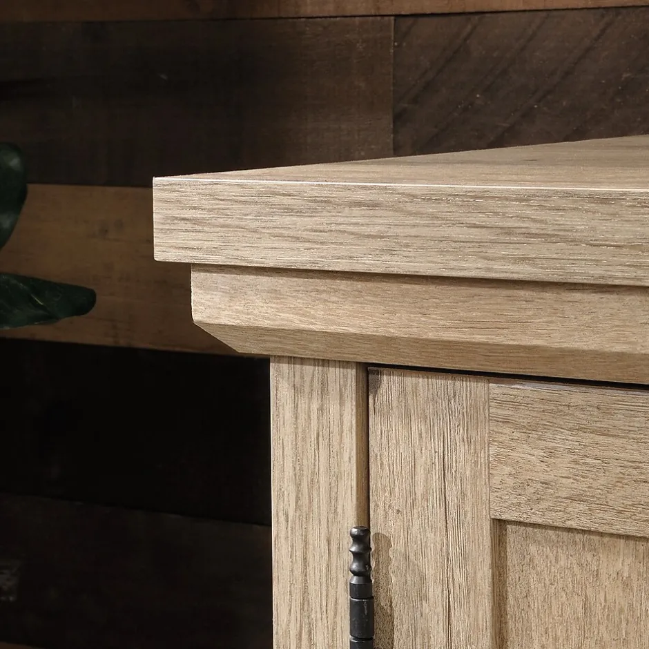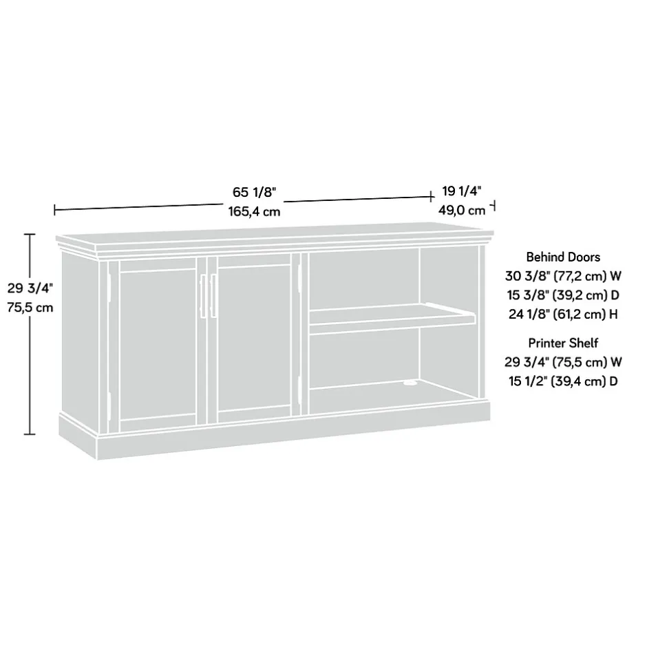 Versatile storage in your home should feature hideaway and open storage. Voila! In comes the file credenza from the Aspen Post collection. Whether your home office or living room need extra storage, this wood storage credenza has the answer for you. Designed with your home office needs in mind, this office cabinet has a pull out, adjustable printer shelf for easy access to your recently printed document. Additionally, there is an adjustable shelf behind the doors to accommodate office or home items of various heights. The top is a 1 thick, durable surface ideal for office or home decor, books, a lamp and photos of your family. Featuring quick and easy assembly with patented slide-on moldings and a light Prime Oak finish, this entertainment credenza adds useful closed and open storage to any room in your home.