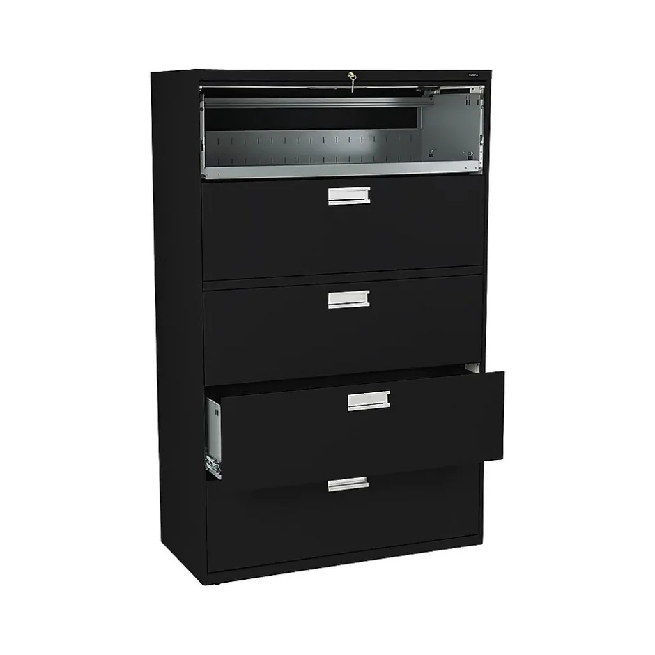 Organize important files and documents with this five-drawer lateral file cabinet. The integrated two-sided locking mechanism prevents unauthorized entry, and the built-in counterweight prevents the cabinet from tipping forward when the drawers are fully extended. This HON Brigade 600 lateral file has heavy-duty steel ball bearings that makes the drawers easy to open and close, and the all-welded case helps the cabinet stand up to commercial environments.