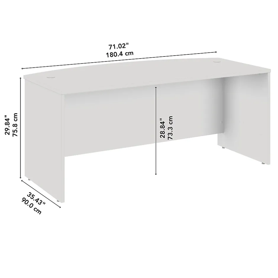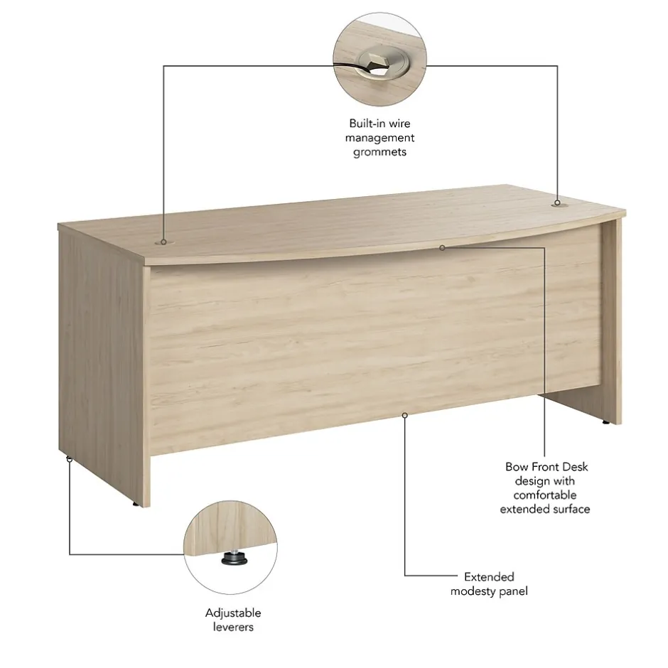 Give your office the quality you need and the style you deserve with the Bush Business Furniture Studio C 72W Bow Front Desk. The extended surface offers extra space to spread out with a computer and more while giving guests a rounded front to pull up a chair and collaborate. With a thermally fused laminate finish, the Bow Front Desk stands up to years of everyday use. The classic office desk design is available in your choice of several contemporary or traditional finishes to fit any professional environment. Keep pesky computer cords out of your way with the cable management system for an organized work surface. Combine the Bow Front Desk with matching products and accessories from the Studio C Collection to create a unique office fit for the way you work. This computer desk is backed by a 10 Year Warranty and meets ANSI/BIFMA test standards. American made with U.S. and imported parts.