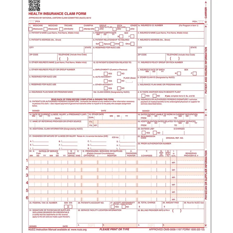 Use these easy-to-read insurance claim forms for a faster claims process. Printed in scannable, dropout OCR red ink, these documents deliver crisp, clean text and comply with CMS standards and requirements for paper, layout and ink to expedite the receipt of payment for health care facilities. These ComplyRight CMS-1500 forms include 02/12 NUCC revisions and replace the previous 08/05 version.