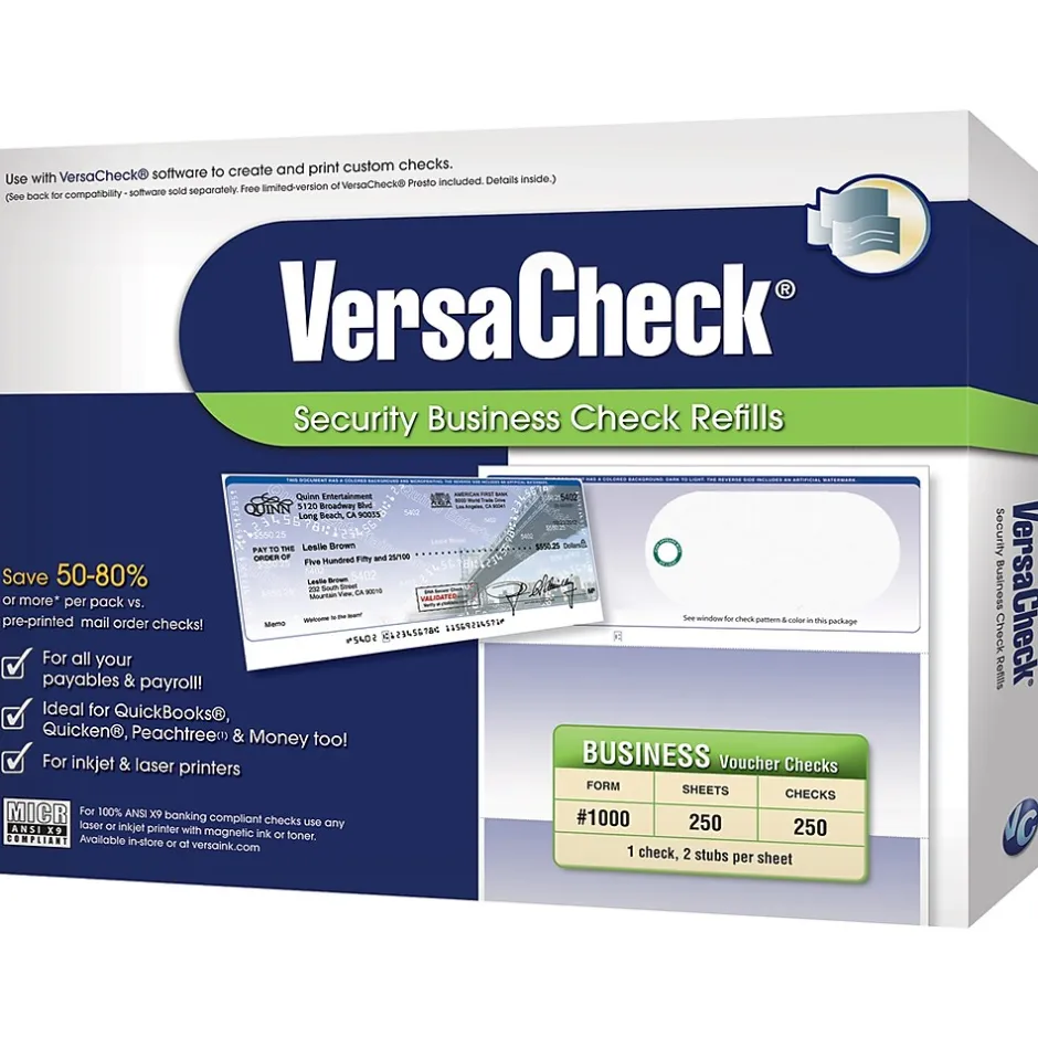 - For automated check clearing to comply with bank regulations, please use VersaInk and VersaToner in your inkjet or laser printer