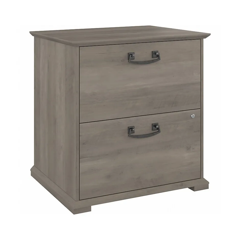 The Bush Furniture Homestead farmhouse-style lateral file cabinet offers a practical storage solution with an appealing modern farmhouse style. This filing cabinet utilizes Tip Guard safety features that include a stable design, a counterweighted back panel, wall attachment hardware, and safe-open drawers. Locking file cabinet’s drawers pull out one at a time for safe use and each support up to 50 lbs. Full-extension ball bearing slides provide easy-reach access to the letter-, legal-, and A4-size paperwork. A single lock secures both drawers for your privacy. Decorative trestle patterns, chamfered profile edges, and antique silver hardware give this cabinet a casual farmhouse style. This file cabinet has been tested to meet the ANSI/SOHO quality standards for safety and performance and is backed by a 1-year limited warranty. See the complete Homestead collection for more items.