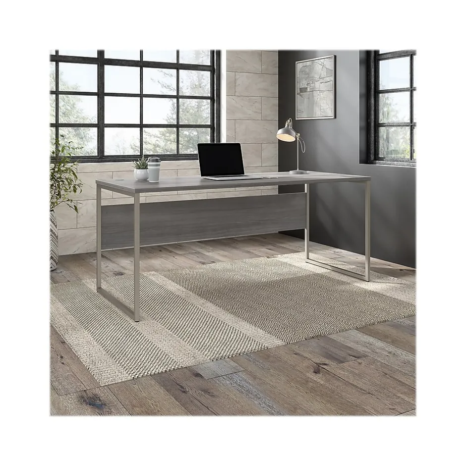 The Bush Business Furniture Hybrid 72″W x 30″D computer table desk blends a durable work surface with sturdy metal legs to offer a stylish, long-lasting solution for the modern professional. Tackle your next project or assignment with a computer, books, paperwork, and more on a desktop that supports up to 200 lbs. A built-in wire management grommet keeps cords and cables in order, so your work area remains free from unnecessary clutter. The computer desk’s open leg design and finished privacy panel allow it to look great facing any direction in a home or professional office environment. Find the perfect look for your space with five contemporary finish options: black walnut, modern hickory, platinum gray, storm gray, and white. This modern desk has been meticulously tested to meet or exceed ANSI/BIFMA quality standards for safety, durability, and performance and is backed by the Bush Business Furniture 10-year manufacturer warranty. See the full Hybrid collection for coordinating items to enhance your workspace as needed, including file cabinets, bookcases, and storage cabinets (coordinating items sold separately). American-made with US and imported parts.
