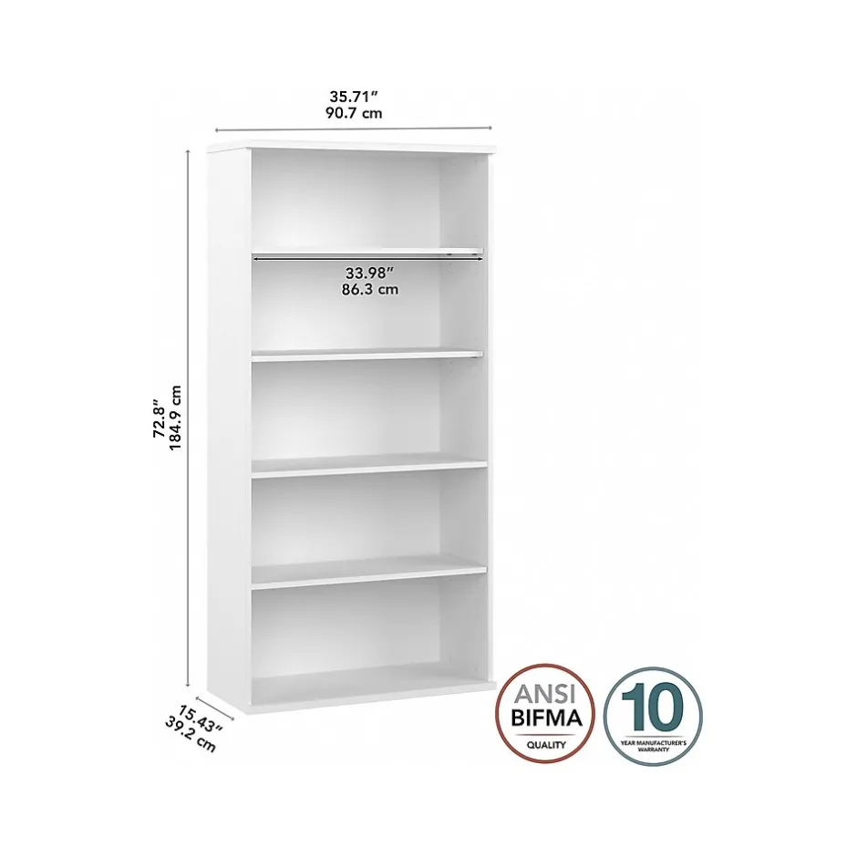 The Bush Business Furniture Hybrid tall five-shelf bookcase offers a stylish, long-lasting storage and display solution for the modern professional. Organize books and other reference materials, or give your workspace a personal touch with pictures and decorations on shelves that support up to 50 lbs. each. Two shelves are fixed for stability, while three can be raised or lowered to accommodate items of various sizes. The tall bookcase’s stable design and included wall attachment hardware make it a safe choice for use in virtually any home or professional office environment. Find the perfect look for your space with five contemporary finish options: black walnut, modern hickory, platinum gray, storm gray, and white. This tall bookcase cabinet has been meticulously tested to meet or exceed ANSI/BIFMA quality standards for safety, durability, and performance and is backed by the Bush Business Furniture 10-year manufacturer warranty. See the full Bush Business Furniture Hybrid collection for coordinating items to enhance your workspace as needed, including computer desks, file cabinets, and storage cabinets (coordinating items sold separately). American-made with US and imported parts.
