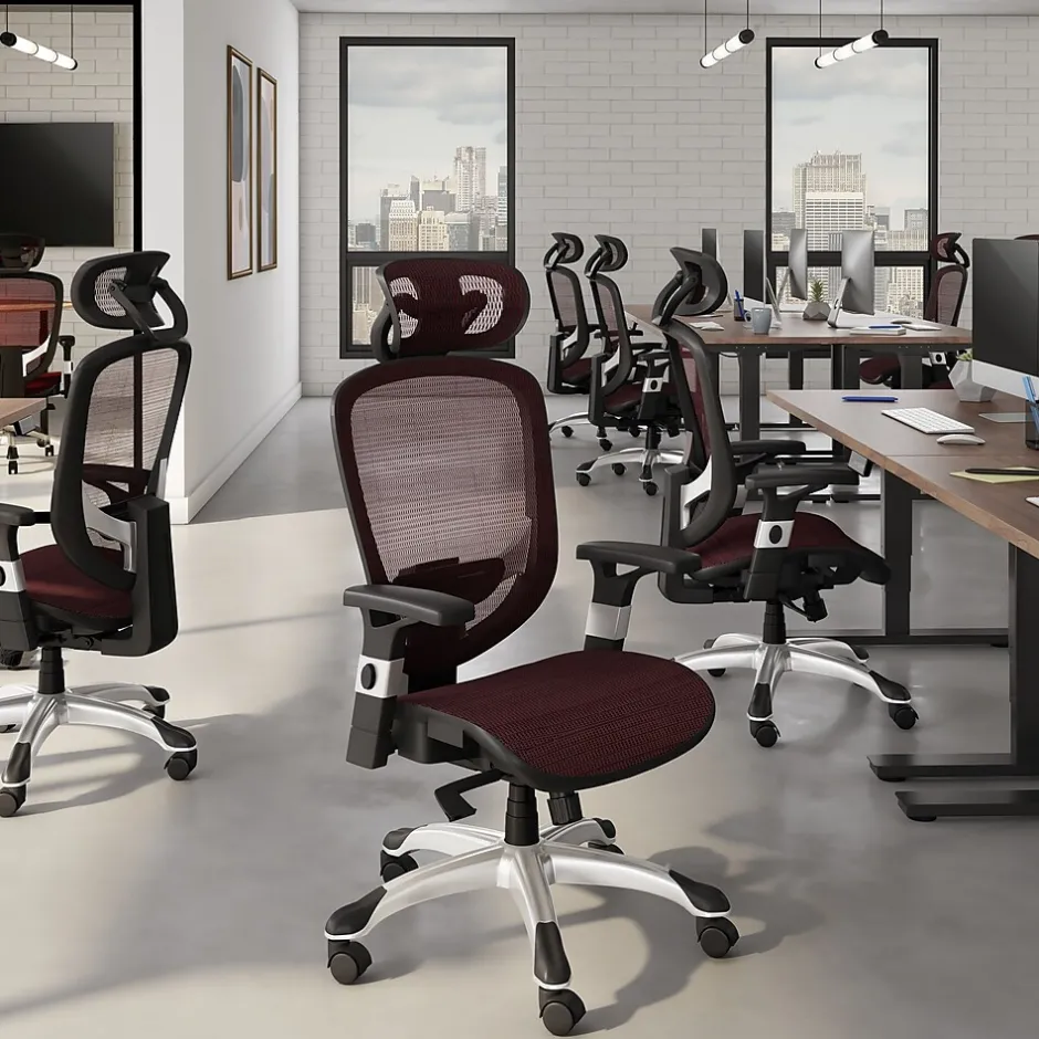 Upgrade your workspace with the Staples Hyken mesh task chair. Designed for productivity and comfort, it offers adjustable armrests and seat height for personalized support. Stay cool with its mesh back, ensuring airflow for prolonged comfort. Easily tailor recline resistance with the tension knob and secure your preferred angle with the upright tilt lock. Its ergonomic build and adjustable lumbar support provide stability and relief, while the five-star base with casters ensures smooth mobility. Meeting ANSI/BIFMA standards, it guarantees safety and performance. Additionally, the adjustable headrest enhances neck support. Say hello to a more productive and enjoyable workday, backed by the assurance of quality and value.