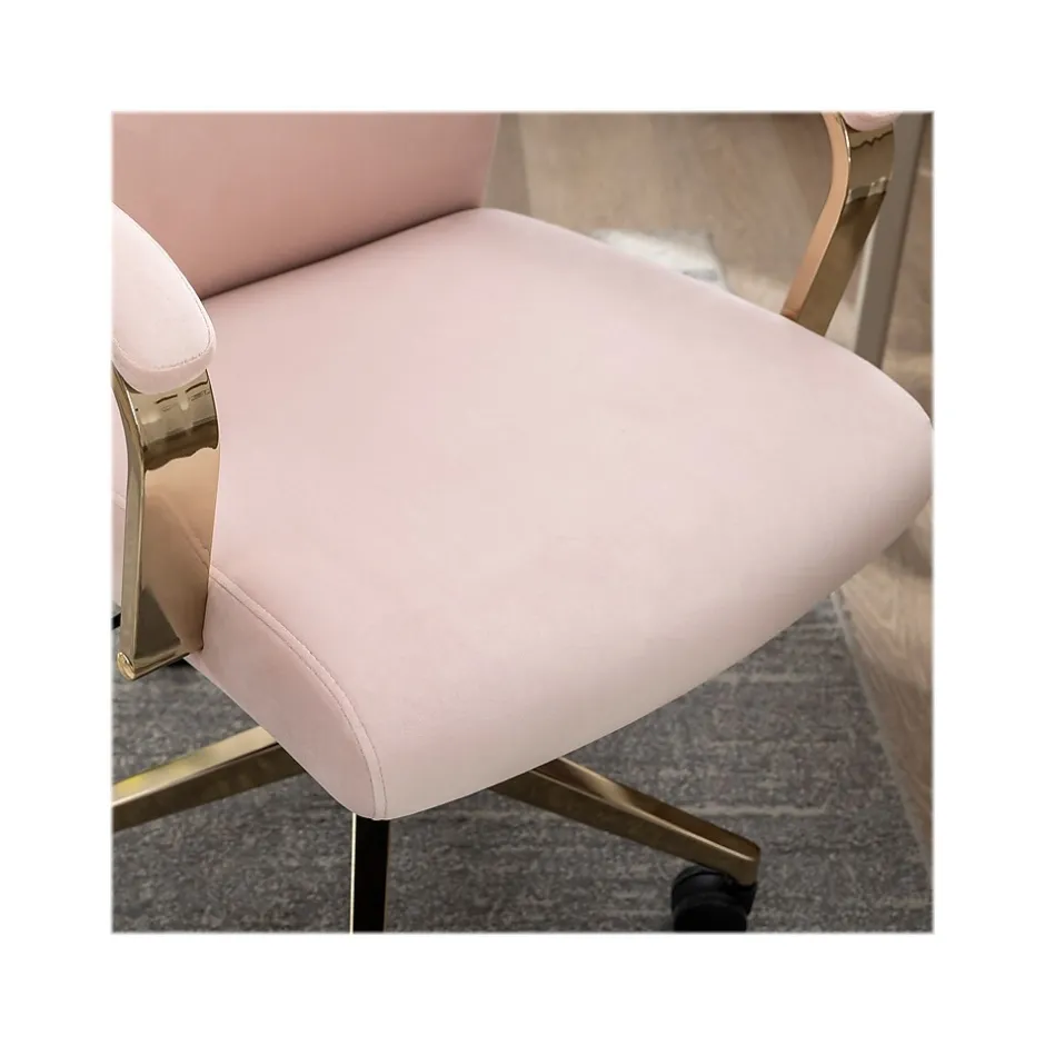 - Features a soft, velvety microsuede fabric upholstery in blush color with metal arms and a heavy-duty metal base in gold-tone plating