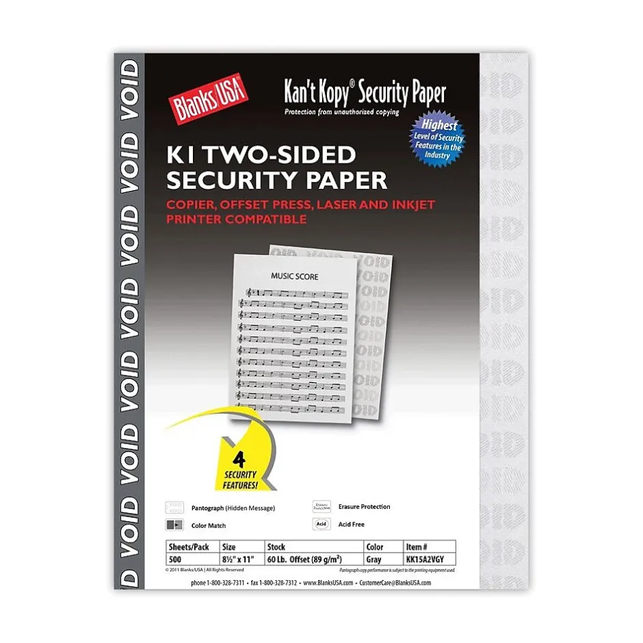 Blanks/USA® Kan’t Kopy® K1 2-Sided security paper in gray color measures 8 1/2″ x 11″ and works with copiers, inkjet, laser as well as offset printers. Paper is free from acid and preserves documents for longer period of time, sold as 500 per pack.
