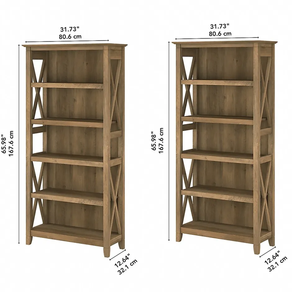 The Bush Furniture Key West tall five-shelf bookcase set is a perfect way to show off your favorite artwork, photos, plants, and more. These matching bookcases each include three adjustable shelves to accommodate items of various sizes and two fixed shelves for stability. Each shelf supports up to 50 lbs. so you can store your collection of paperback and hardcover books or display decorations with confidence. Place the tall bookshelf set side by side to create a storage wall or position them separately based on the needs of your space. Stylish touches include X-pattern accents on the side panels as well as a sturdy and attractive post-leg design. Wall attachment hardware is included for family-friendly safety and security in any home office or living room. These five-shelf bookcases are tested to meet ANSI/SOHO quality standards for safety and performance and are backed by a 1-year manufacturer warranty.