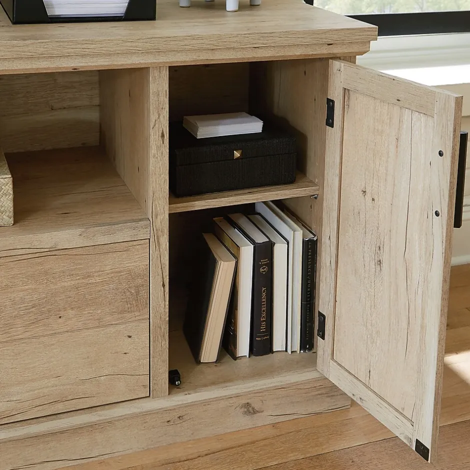 A multipurpose file credenza, like this one from the Mason Peak collection, allows the highest level of configurability and storage options to give you the office space you’ve always dreamed of. The top of this office storage credenza features a strong and lightweight 1″ panel constructionmeaning, it is perfect for your heavier office essentials while remaining easy to assemble and rearrange. A melamine surface makes the top of this office storage cabinet resistant to heat, stains, and scratches. This storage credenza features an adjustable shelf behind the door located on the right side. The adjustable shelf allows you to modify the file cabinet to accommodate items of various heights. Don’t forget the hanging files! A piece of commercial office furniture would not be complete without a file drawer with full extension slides that holds letter or legal-size hanging files. This keeps your documents organized and easy to locate. Finished in a Prime Oak and featuring attractive hardware, this resimercial file credenza adds an interesting look and optimal storage solutions to your office.