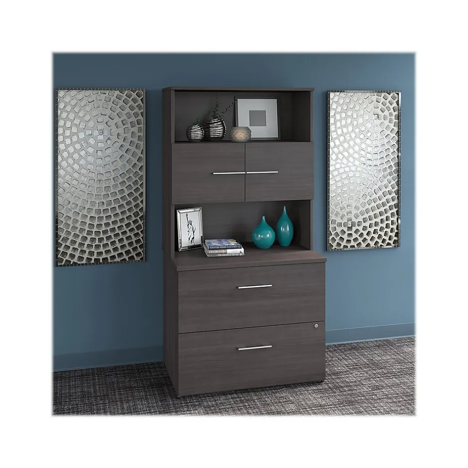 Organize paperwork and show off your favorite pictures, awards, and decorations with the Bush Business Furniture Office 500 lateral file cabinet and hutch. This file cabinet with hutch is perfect for maintaining an organized workspace while showcasing the style and personality of today’s professional. Two file drawers open on smooth full-extension ball bearing slides for an easy reach to legal-, letter-, and A4-size paperwork. A single lock secures both drawers to protect files that contain sensitive information. The bookcase hutch attaches to the top of the file cabinet, adding two open shelves that are great for storing books or displaying your favorite pictures, awards, and decorations. An elevated two-door storage cabinet conceals the reference materials and supplies you want kept in order but out of sight. This tall bookcase hutch with drawers is tested to meet ANSI/BIFMA standards for safety and performance and is backed by a 10-year warranty. American-made with US and imported parts.