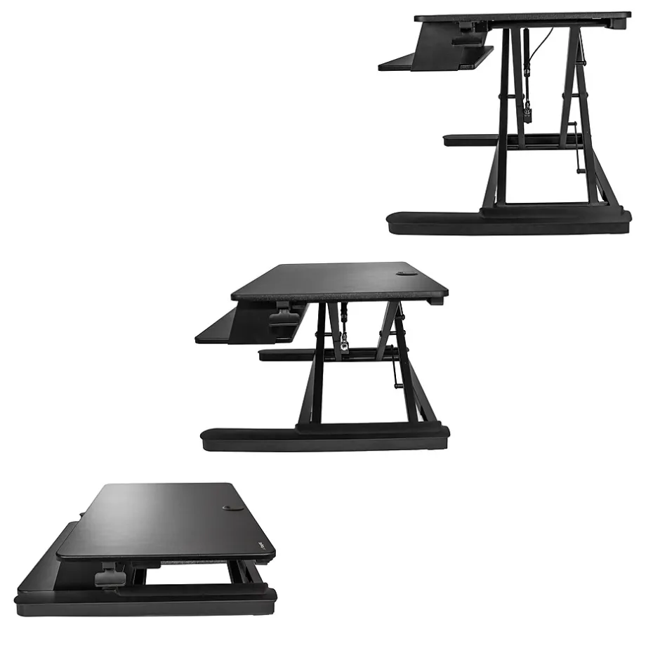 Work in comfort and enhance productivity by turning your desk into a spacious sit-stand workspace – Sit Standing Desk Converter – Large Work Surface 35″ (Wide) – Stand up Desk Converter for two monitors up to 24″ or one monitor up to 30″- One-touch height adjustment range of 15.7″/399 mm – Place your display/s on the workstation or use the grommet hole to mount a monitor arm such as StarTech.com ARMDUAL or ARMPIVOT or ARMSLIM (sold separately) – Ergonomic standing desk converter