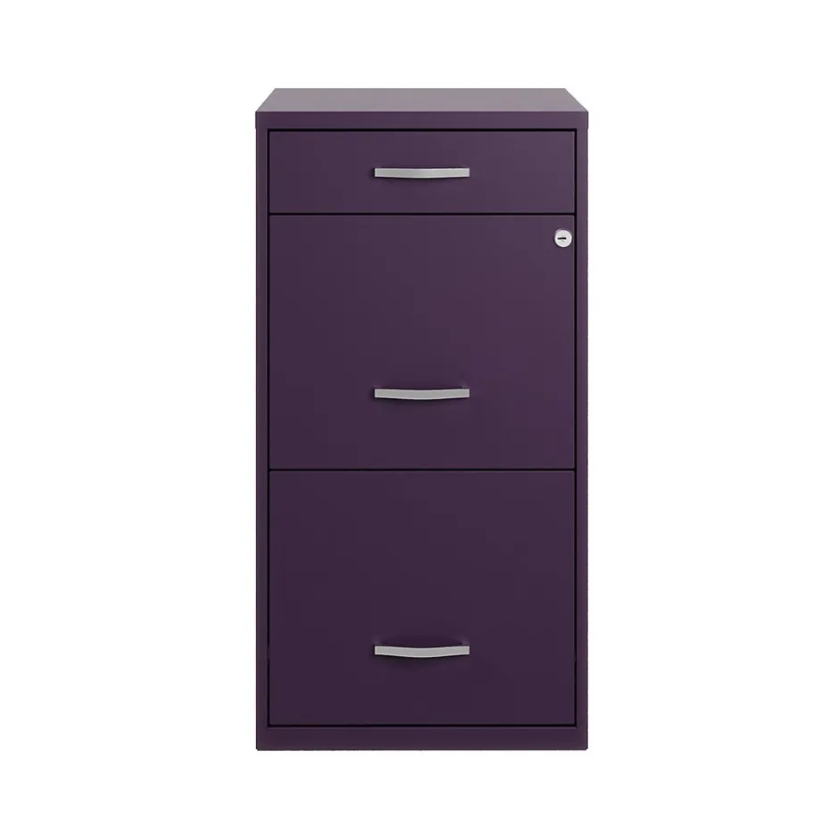 The Three Drawer Metal File Cabinet is a multi-functional storage solution perfect for files, office supplies, and accessories for your small professional office or home office. Featuring two file drawers and one storage drawer, this file cabinet features steel construction and a smart, efficient design. Our compact filing cabinet works well in small spaces and fits under most work surfaces or office desks. Each drawer features high-sides to accommodate letter-sized hanging files. The top accessory drawer is perfect for office storage and organization. Using a patented glide suspension, the drawers have a smooth open and close slide with a three-quarter drawer extension to prevent tipping. In addition, you can keep your files and possessions secure by using the built-in lock for the top two drawers. The painted steel surface is non-porous and easy to clean. Bring organization and function to your home or office with this three-drawer file cabinet.