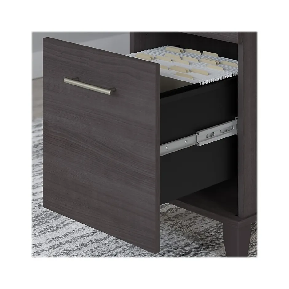 An expansive work surface and built-in storage make the Bush Furniture Somerset office desk with drawers a perfect choice for your home office. The spacious desktop offers plenty of room to spread out with a computer and paperwork and includes a wire management grommet to keep cords and cables secure and out of sight. The desk’s file drawer opens on full-extension ball bearing slides for easy access to legal- and letter-size documents, while a box drawer keeps the office supplies and utensils you need close by. A finished back side allows the desk to look great no matter where it’s positioned in the room. The office desk with drawers meets or exceeds ANSI/SOHO standards for safety and performance and is backed by a 6-year manufacturer limited warranty.