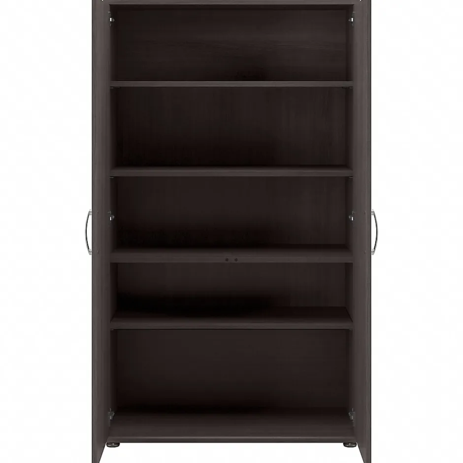The Bush Business Furniture Universal five-piece modular storage set with floor and wall cabinets features commercial-quality designs and contemporary styling that suits virtually any home or professional environment. Organize your office, break room, garage, laundry room, or other work or living space with storage furniture that’s built to last and offers plenty of room for supplies, materials, and equipment. Both the floor storage cabinet with doors and tall storage cabinet combine fixed and adjustable shelving to accommodate items of various sizes. Two wall-mounted cabinets also contain one fixed and one adjustable shelf each for flexible, space-saving storage. Additional office supplies, tools, and household items can be stashed inside the three-drawer cabinet. This cabinet set has been tested to meet ANSI/BIFMA standards for safety and performance and is backed by a 10-year warranty