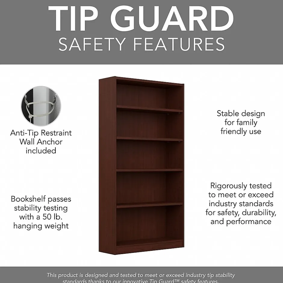 The Bush Furniture Universal Tall 5 Shelf Bookcase – Set of 2 provides a versatile organization solution that allows you to show off your personal library or brighten up the room with pictures and decorations. Each Bookcase has three adjustable shelves that move up and down to accommodate larger items like binders and photo albums while two fixed shelves offer added stability. The sturdy one-inch thick shelves prevent sagging and have a weight capacity of 50 pounds each, so storing magazines, hardcover books, or vinyl records is never a problem. Tip Guard(TM) safety features include a stable design and wall attachment hardware for family-friendly safety in any space. The bookcases have been tested with a 50 pound hanging weight to create a safe environment in any space. This tall bookshelf set meets ANSI/BIFMA standards for safety and performance and is backed by a 1 Year Warranty.