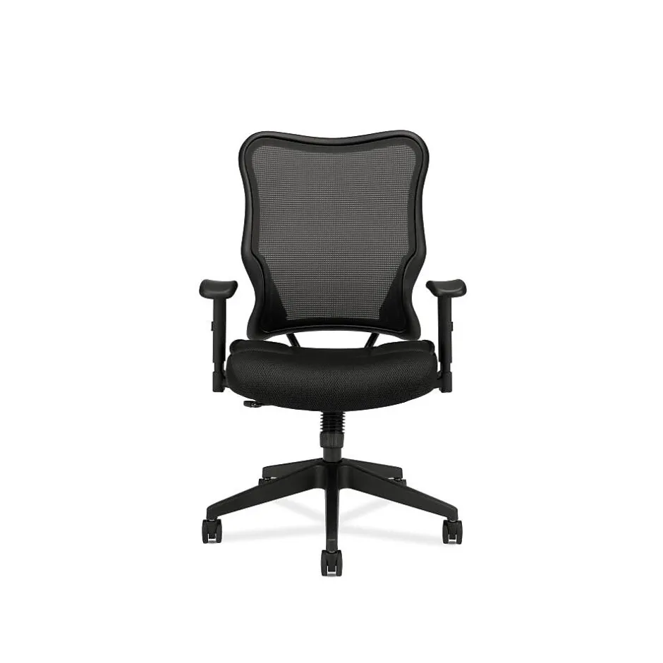 Black sandwich mesh seat and height-adjustable arms give this chair an upscale feel at a compelling price. Seat upholstery color is Black and back mesh color is Black.