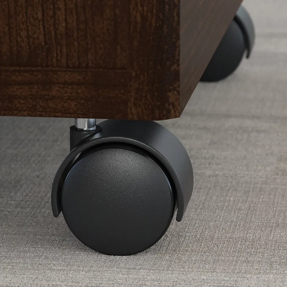 Enjoy mobile storage that works wherever you do. The Bush Business Furniture Westfield 3 Drawer Mobile File Cabinet rolls smoothly on dual-wheeled, hooded casters for years of easy, everyday use. Slide the Cabinet under a coordinating Westfield Desk to save space or move it around the office as needed. A single lock secures the bottom two drawers to protect your letter, legal and A4 files. The file drawer glides on smooth, full-extension ball bearing slides for an effortless reach to the back, and two box drawers store office supplies. Brushed Nickel hardware makes a lasting impression. Westfield offers endless layout options, expansion opportunities and 7 finishes. This affordable office furniture withstands the rigors of a 40-plus hour work week and comes with a 10 Year Warranty. American made with U.S. and imported parts.